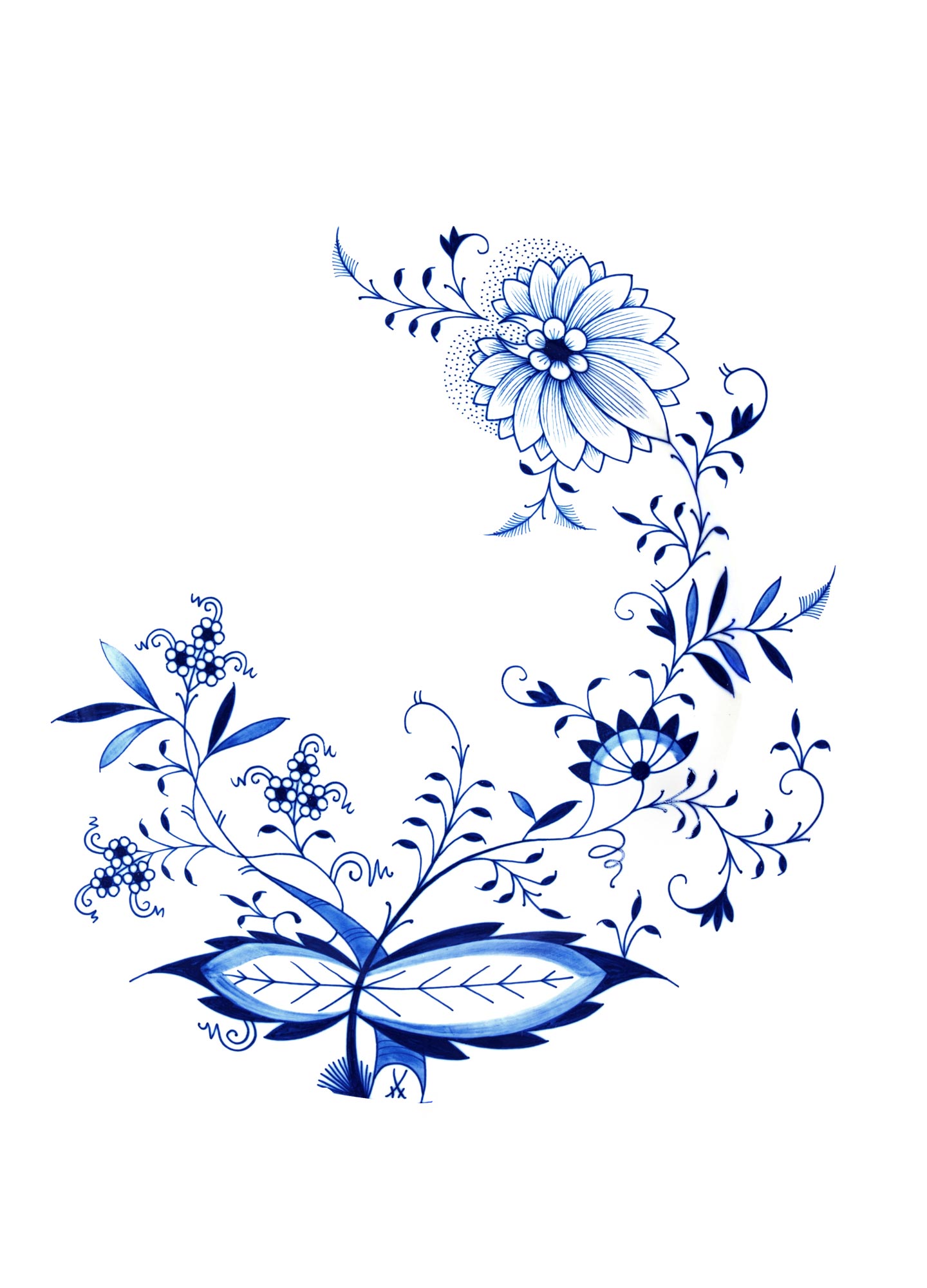 ZwiebelmusterDie Geschichte des „Zwiebelmuster“ ist eingebettet in die Entwicklung der Meissener Blaumalerei und ihrer besonderen ästhetischen Wirkung auf Porzellan. Bereits unmittelbar nach Gründung der Manufaktur beginnt die Suche nach einem ganz besonderen Blau, welches das Weiß des Porzellans hervorheben, gleichzeitig mit ihm harmonieren soll. Die Verbindung der Elemente Kobalt und Sauerstoff erweist sich nach langen Versuchsreihen schließlich als sehr hitzebeständig und optimal geeignet für Porzellan mit hohen Brenntemperaturen. Inspiriert von damals überwiegend blau gestalteten ostasiatischen Dekoren entsteht so um 1731 das strahlend blaue, heute weltberühmte Meissener „Zwiebelmuster“. Tatsächlich stellt es keine Zwiebeln dar, sondern zeigt – in Anlehnung an seine Vorbilder – Pfirsich und Melone auf dem Tellerrand sowie Bambusstock und die zarten Blüten der Chrysantheme in der Mitte.