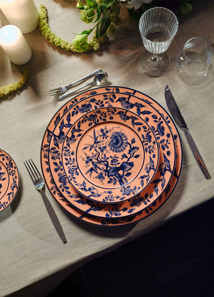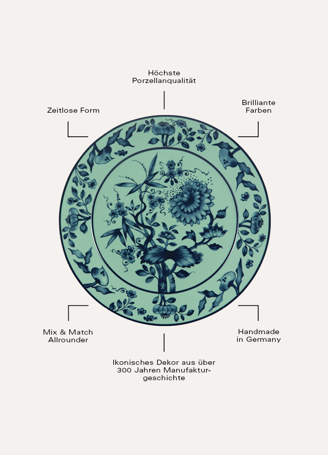 Tradition und Moderne – MEISSEN vereint traditionelle Handwerkskunst und zeitgenössisches Design auf bisher nie dagewesene Weise. Für die neue Kollektion „The Original“ schöpft die Porzellan-Manufaktur MEISSEN aus dem wertvollen Schatz ihrer über 300-jährigen Geschichte und kreiert ein einzigartiges Service für den modernen Tisch. Die Ursprünge des Dekors lassen sich bis in die erste Hälfte des 18. Jahrhunderts zurückverfolgen. Um 1730 entstanden in der Porzellan-Manufaktur MEISSEN die ersten Varianten des weltberühmten Zwiebelmusters auf europäischem Hartporzellan. Inspiriert von Motiven auf chinesischen Porzellanen sowie der Fayence, entwickelten die Meissener Blaumaler das ikonische, kobaltblaue Meissener Zwiebelmuster, welches zur bekanntesten Unterglasurmalerei der Manufaktur wurde. Den Namen „Zwiebelmuster“ erhielt das Dekor aufgrund der im Europa des 18. Jahrhunderts unbekannten Melone, die für eine Zwiebel gehalten wurde und in Kombination mit dem Pfirsich bis heute die Tellerfahne schmückt. Bevor sich das heute als klassisches Zwiebelmuster bekannte Dekor durchsetzte, gab es mehrere Varianten gleichzeitig.