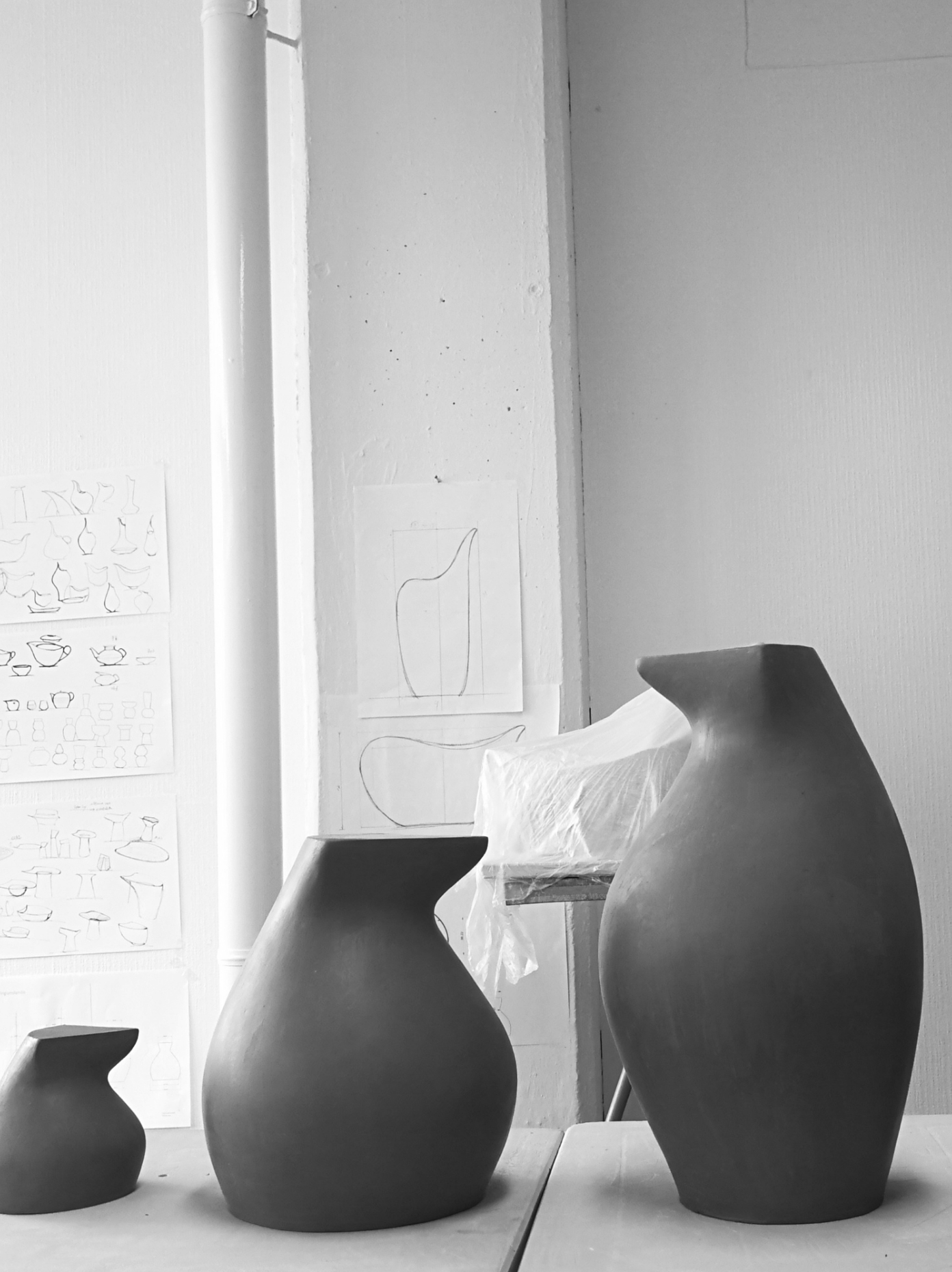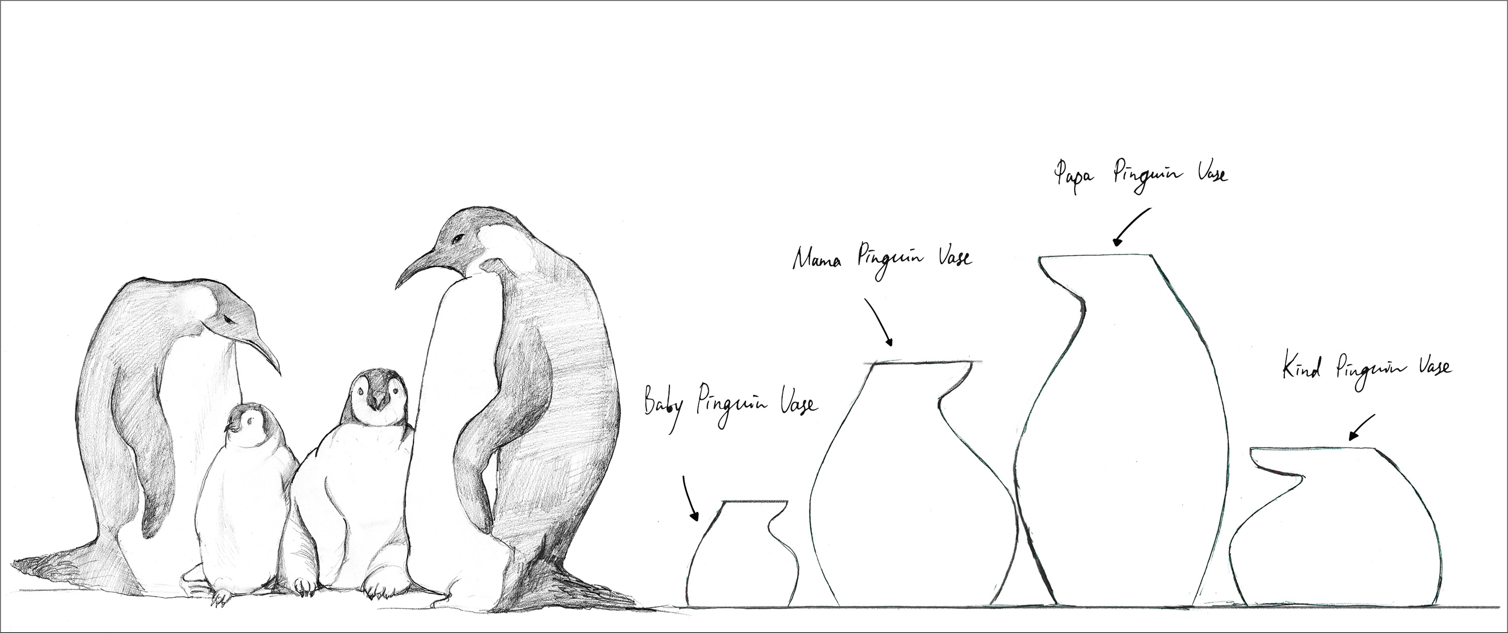 Die Leitidee zur Entwicklung der „Antarctica“ Kollektion kam Zhuoyu Hou beim Anblick einer Pinguinfamilie im arktischem Eis – Papa, Mama, ein großer und ein kleiner Bruder. Die Silhouette der Pinguine verwandelte sie in ihren ersten Skizzen zu Krügen und Vasen. Die geschwungenen Kurven stehen dabei im Kontrast zu den kantigen Öffnungen und visualisieren den Bauch und Kopf der Pinguine. Ihre ersten Modelle aus Ton zeigten, wie spannungsvoll die organische Formensprache mit ihren Rundungen im Kontrast mit den eckigen, geradlinigen Elementen auf den Betrachter wirkten. Da Ton sehr flexibel und anpassungsfähig ist, konnte sie mit ihrer Arbeit nicht nur ein optisch ansprechendes Design schaffen, sondern auch direkt die Haptik berücksichtigen. Denn passen die Proportionen des Porzellans zur Handhabung, wird es häufiger benutzt. Dies wiederum, so Zhuoyu Hou, verstärkt die Schönheit der Designstücke. Mit diesem Anspruch hat die Designerin Krüge entwickelt, die vielseitig einsetzbar sind. Ob als Vase, Wasserkaraffe, Milchkännchen oder Sauciere, die Gefäße werden im modernen Interieur zu einem absoluten Blickfang. Um die Pinguin-Vasen herum, entwickelte Zhuoyu Hou eine ganze Landschaft. So wurden aus Eisschollen und Eisbergen verschiedene Schalen, Kerzenhalter und Becher. Allen Objekten schenkte sie eine harmonisch reduzierte Ästhetik – ganz im Sinne des puristischen Lebensstiles.