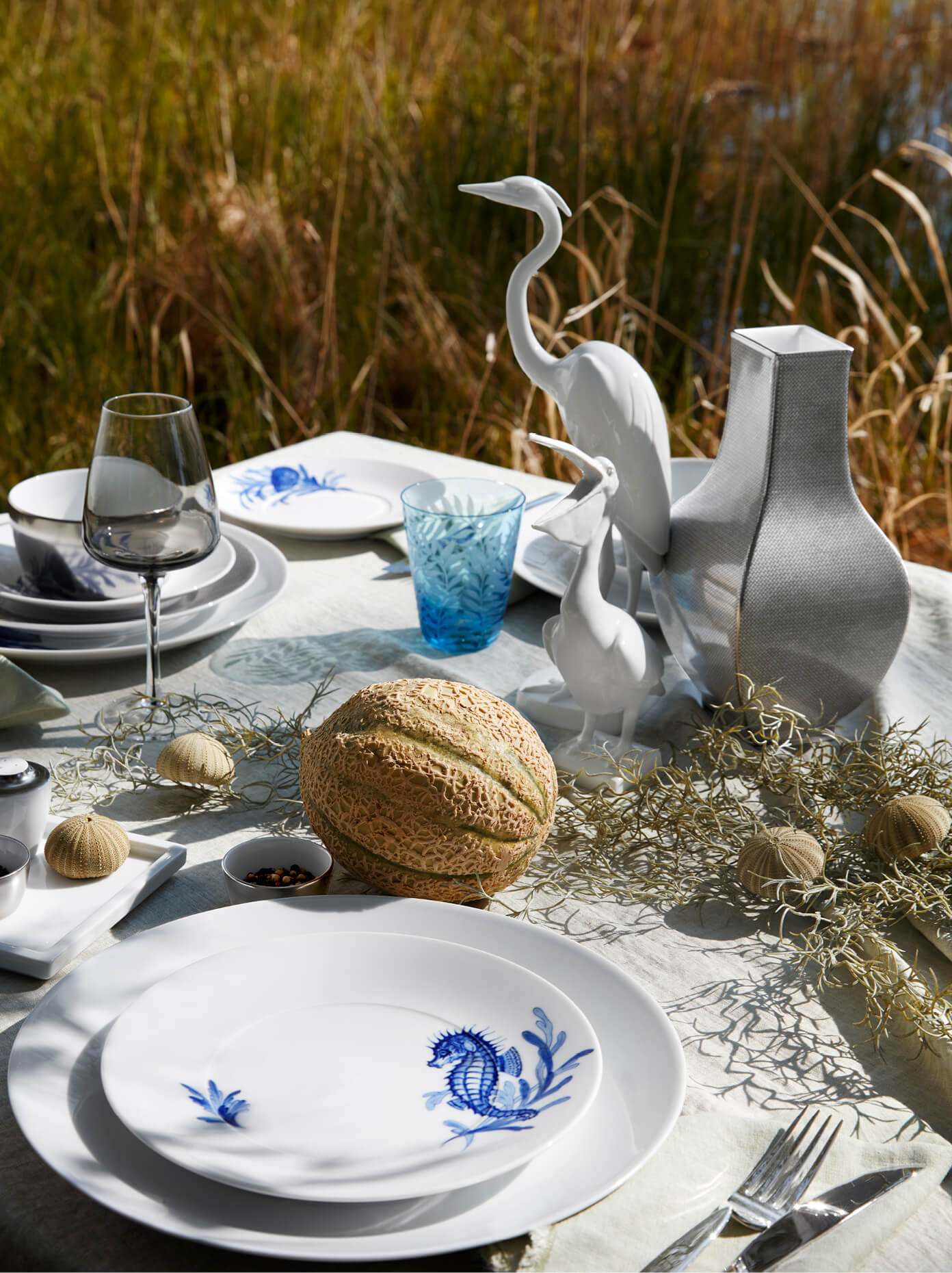 Wenn es um sommerliche Tisch & Tafel Highlights geht, dann ist unsere „MEISSEN Cosmopolitan® Blue Treasures“ Kollektion eines unserer schönsten Aushängeschilder, welche eine Verbindung von traditionellem Handwerk und moderner Ästhetik darstellt. Die lebendigen Unterwassermotive, handgemalt in unserem ikonischen Kobaltblau, wirken auf dem strahlenden Weiß des Porzellans sowohl zeitlos als auch innovativ. Diese Kollektion umfasst nicht nur funktionale Stücke wie Teller und Schalen, sondern auch kunstvolle Objekte, die jede Barbecue-Setting verschönern. Die dynamischen Darstellungen von Meereslebewesen, wie Fische, Hummer und Seepferdchen, scheinen fast lebendig zu werden und fügen jeder Mahlzeit eine Ebene des visuellen Genusses hinzu. Durch die Verwendung von ausschließlich hochwertigen Materialien und der detaillierten Fertigung ist jedes Stück sowohl ein Kunstwerk als auch ein Garant für Langlebigkeit und Alltagstauglichkeit.