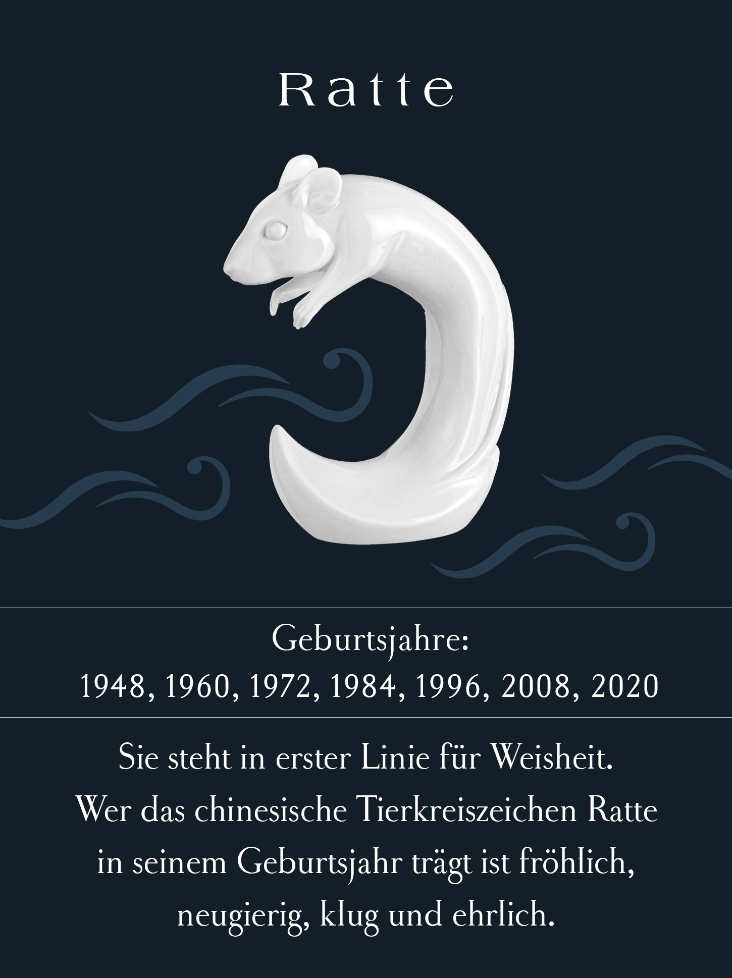 Der althergebrachte Glaube, dass Planeten und Sterne mit ihren festen Zyklen einen Einfluss auf das irdische Leben haben, ist in China nach wie vor weit verbreitet und ein Bestandteil der Kultur. Die sagenumwobenen zwölf chinesischen Tierkreiszeichen spielen dabei eine besondere Rolle im Leben der Menschen. Früher waren sie wichtig, um die einzelnen Jahre zu datieren. Zudem wurden jedem Tier menschliche Eigenschaften zugesprochen. Noch heute wird den Deutungen Glauben geschenkt, denn sie sollen Einfluss auf das Leben haben. Der Überlieferung nach werden den Tierkreiszeichen in den jeweiligen Geburtsjahren folgende Bedeutungen zugesprochen: Ratte (Geburtsjahre: 1924; 1936; 1948; 1960; 1972; 1984; 1996; 2008; 2020; 2032) Die Ratte steht in erster Linie für Weisheit. Wer das chinesische Tierkreiszeichen Ratte in seinem Geburtsjahr trägt ist fröhlich, neugierig, klug und ehrlich. Büffel (Geburtsjahre: 1925; 1937; 1949; 1961; 1973; 1985; 1997; 2009; 2021; 2033) Menschen des Zeichens Büffel werden als fleißig, ehrgeizig und zuverlässig eingeschätzt. Entschlossen setzen sie all ihre Kraft ein, um das Leben ihrer Familie so angenehm wie möglich zu machen. Tiger (Geburtsjahre: 1926; 1938; 1950; 1962; 1974; 1986; 1998; 2010; 2022; 2034) Der Tiger ist stark und von seiner Wesensart sehr mutig. Menschen, die in diesem Tierkreiszeichen geboren sind, sind Idealisten, die genauso leidenschaftlich wie auch fürsorglich sein können. Hase (Geburtsjahre: 1927; 1939; 1951; 1963; 1975; 1987; 1999; 2011; 2023; 2035) Wer im Jahr des Hasen geboren ist, dem wird nachgesagt, vorsichtig, geduldig und freundlich zu sein. Durch dieses sanfte Wesen fungieren die Menschen oft als Streitschlichter. Drache (Geburtsjahre: 1928; 1940; 1952; 1964; 1976; 1988; 2000; 2012; 2024; 2036) Der Drache ist das einzige Fabelwesen innerhalb der chinesischen Tierkreiszeichen. Er ist kraftvoll, stark und ehrgeizig. Zudem ist er bereit seine eigenen Ziele zurückzustellen, denn es ist ihm wichtiger anderen Menschen zu helfen.
