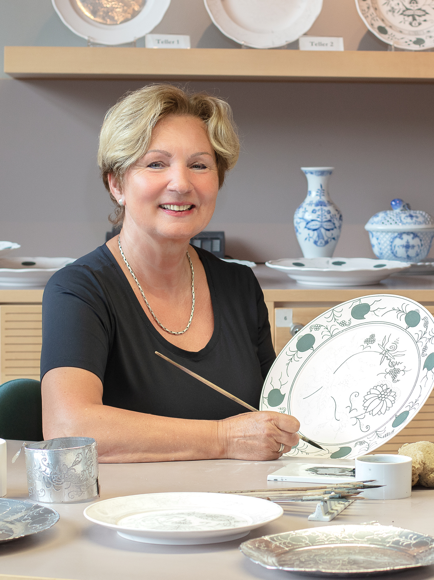 Nichts Geringeres als die Liebe zur Malerei bringt Marlies Moser bereits 1979 in die Manufaktur MEISSEN, wo sie sich gleich zu Beginn auf die Unterglasurmalerei spezialisiert. Nach über 40 Jahren in der Produktion begeistert sie heute die Besucher*innen der Schauwerkstatt der Erlebniswelt Haus MEISSEN mit ihrem Geschick. Und dieses verlangt die Unterglasurmalerei in besonderem Maße. Anders als bei der Aufglasurmalerei wird bei der Unterglasur die Farbe auf den noch ungebrannten, porösen Scherben aufgetragen. Die Farbe sinkt sofort ein, was ein Ausbessern von Fehlern unmöglich macht. Eine Technik,