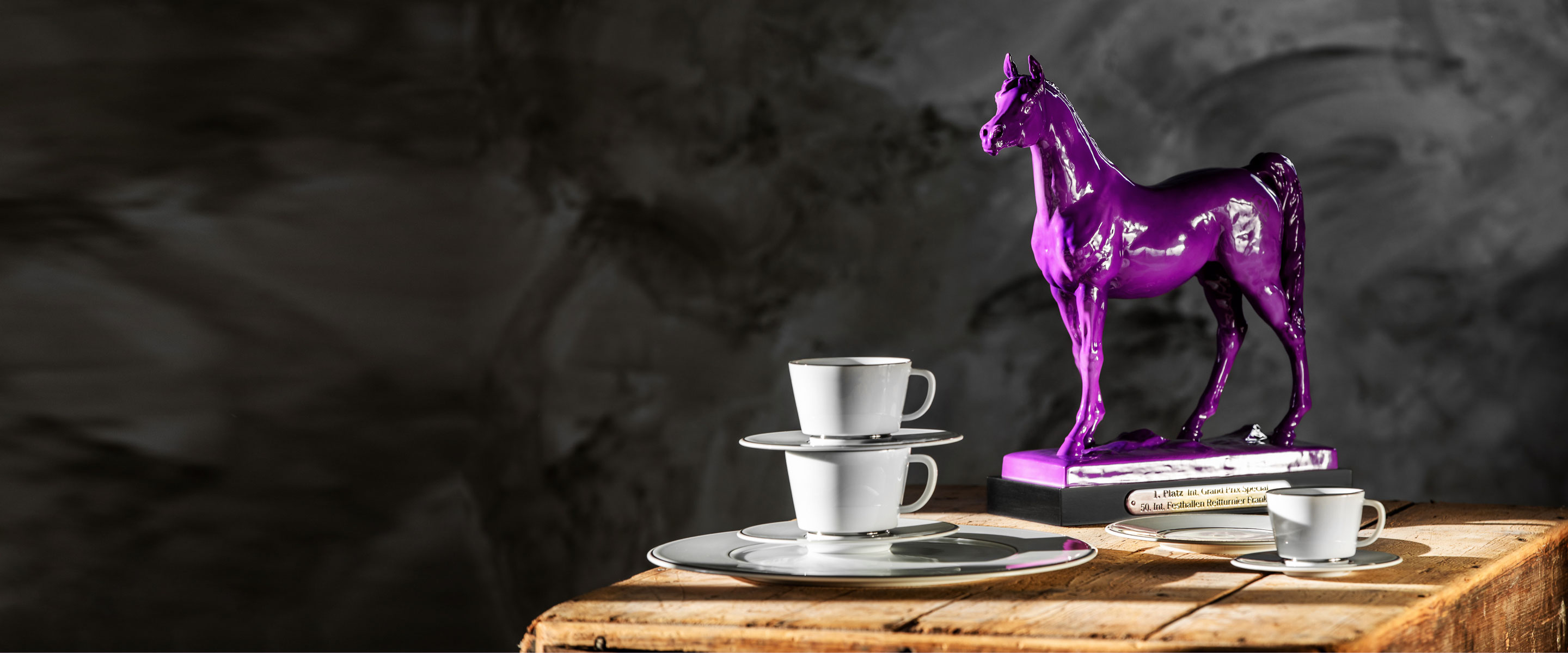 Im Laufe der Jahrhunderte sollten zudem weitere hochtalentierte Modelleure in die Fußstapfen von Kirchner und Kaendler treten und das Portfolio von Meissener Porzellan-Figuren um unzählige atemberaubende Tierplastiken erweitern – ob Paul Walther, Erich Oehme oder auch der große Jörg Danielczyk. Nachdem Danielczyk bereits 9 Jahre für die Manufaktur tätig war, wählte der damalige Modellmeister, Peter Strang, ihn aus einer Reihe von Manufakturisten eher zufällig aus, um ein Pferd zu modellieren. Nicht irgendein Pferd, sondern eine echte Berühmheit des Pferdesports: Die Hessenstute Halla, die zusammen mit Hans Günter Winkler mehrmals Gold bei den olympischen Sommerspielen gewann. Danielcyk schaffte es, den Charakter des tierischen Modells vollständig zu durchdringen und wiederzugeben, sodass der begeisterte Peter Strang ihn als Schüler zu sich nahm und aus ihm den großen Modelleur formte, der er bis zu seiner Pensionierung im Jahre 2017 war. Diese Begabung konnte er auch 2013 bei der Erschaffung des edlen Arabers unter Beweis stellen, welcher als Vorbild für die drei lila Ehrenpreise des IFRF dienten.