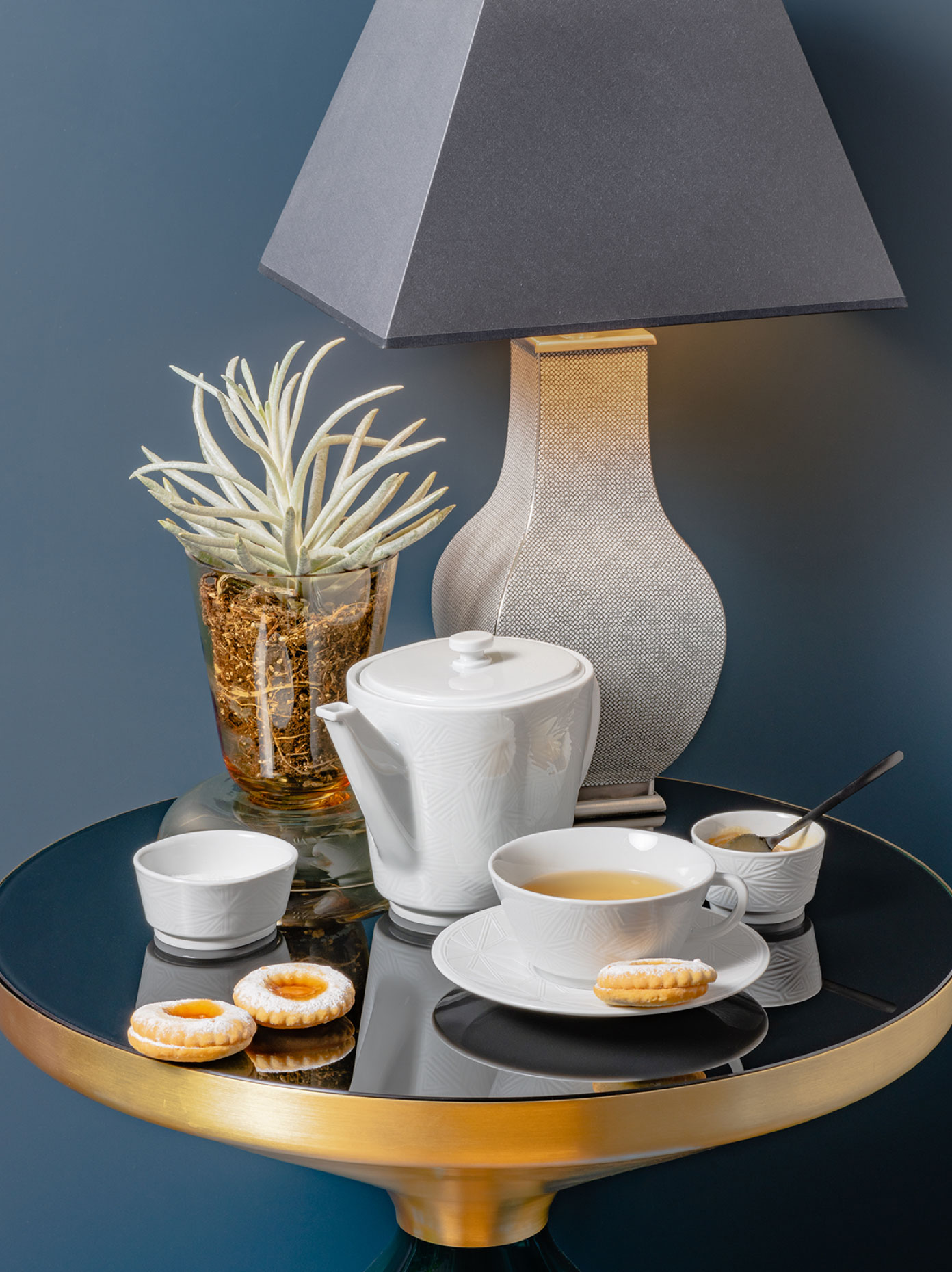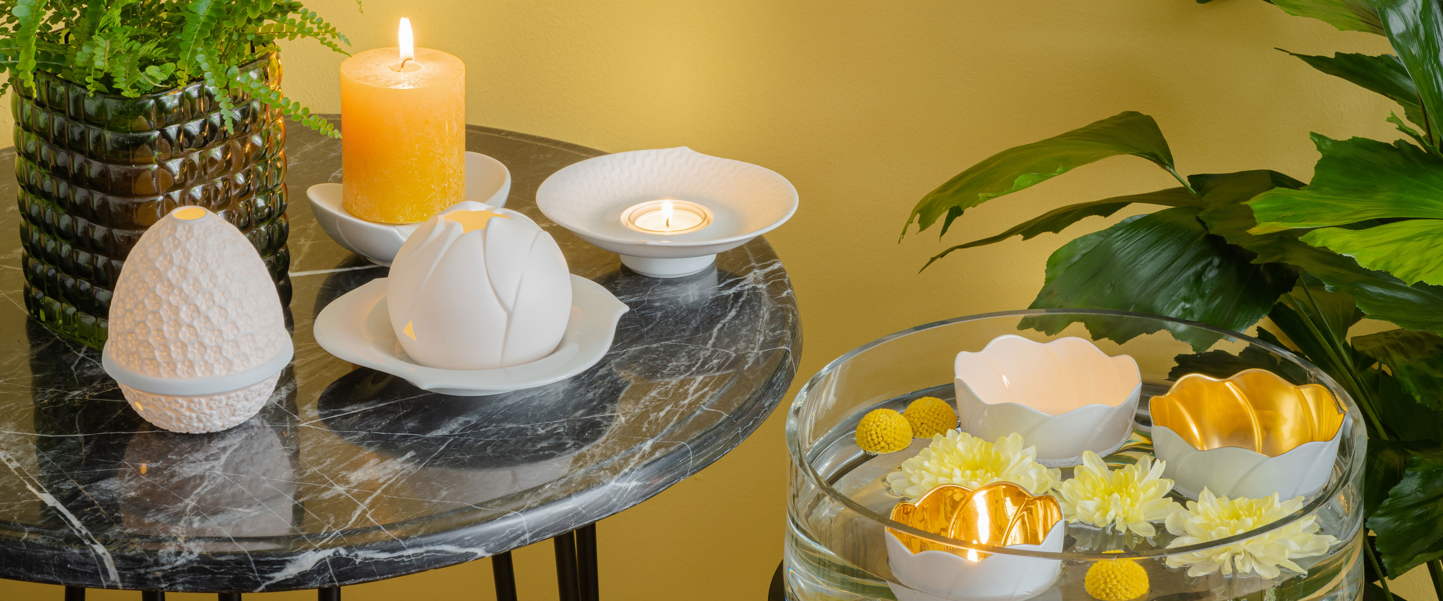 Besonders in den herbstlichen Abenden können uns sanfte Lichter in eine Aura von Wärme und Geborgenheit hüllen. So können Sie mit dezenten Lichtquellen auf den Tischen und Ablagen ein kleines Lichtermeer erzeugen, das Ihren Raum in ein behagliches Ambiente taucht. Also schalten Sie die Festbeleuchtung aus und nutzen Sie zum Beispiel unsere Tischleuchte aus der "MEISSEN® Cosmopolitan" Serie. Mit klarer Linienführung und dekorativen Ausschwüngen ist diese Tischlampe an die Formensprache moderner Hotels angelehnt und versprüht damit ein hohes Maß an Eleganz. Aber auch mit kleinen Lichtern, wie mit dem "Royal Blossom“ Windlicht oder dem Teelicht aus der "Wellenspiel Relief" Kollektion schaffen Sie eine magische Atmosphäre, die Sie in den Bann des Herbstes zieht.