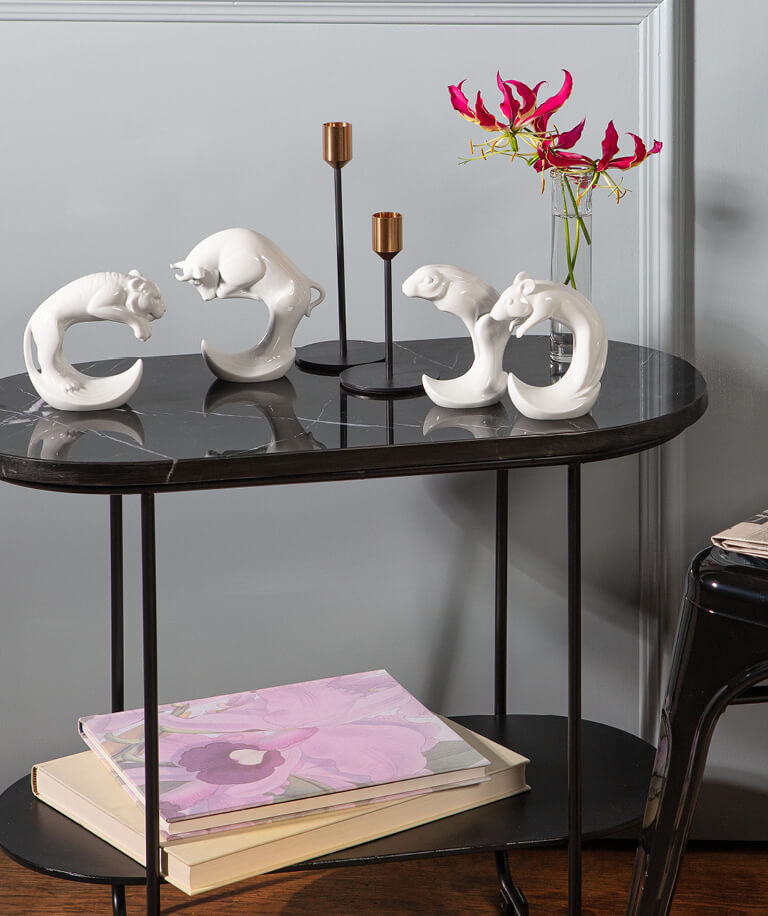 Die künstlerische Interpretation der chinesischen Tierkreiszeichen in der gleichnamigen Kollektion von Maria Walther verleiht den majestätischen Tieren eine lebendige Präsenz. Jede Figur beschreibt die Legende des großen Rennens, welches vom Jade-Kaiser im gesamten Tierreich ausgerufen wurde. Die zwölf Tiere, welche das Ziel als erstes erreichten, sollten im chinesischen Horoskop verewigt werden. Der mächtige Drache wurde als Erstes am anderen Ufer erwartet, jedoch kam er auf seinem Weg an einem Dorf vorbei, welches unter einer erheblichen Dürre litt. So verweilte der Drache im Dorf, um es regnen zu lassen, bevor er seinen Weg fortsetzte – Schlussendlich kam er als Fünfter ins Ziel. Die kraftvolle Bewegung des Drachen wird durch die dynamischen Linien und die lebendige Ausdrucksweise des Porzellans eingefangen. Der Drache, ob in purem Weiß oder golden staffiert, erscheint fast lebendig, bereit, in die Welt zu treten und sein Vermächtnis zu hinterlassen.