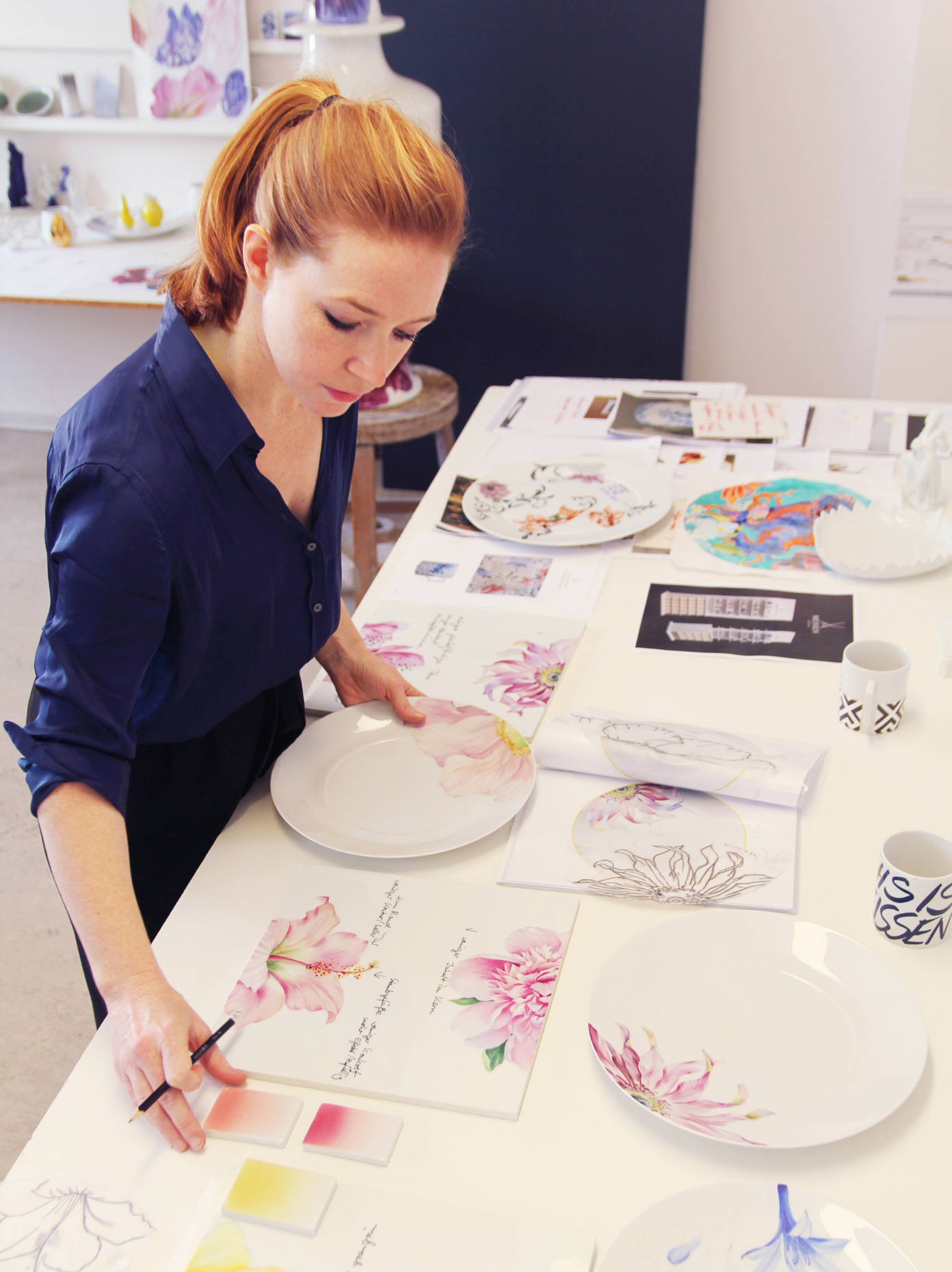 Ihr künstlerischer Schwerpunkt liegt dabei in der Oberflächengestaltung zeitgenössischer Produkte als auch in der Neuinterpretation alter Formen. Dekore sind für Lena Hensel schnelllebiger und wandlungsfähiger als die plastische Gestaltung und eine der Möglichkeiten, sich in der heutigen Zeit neu zu positionieren, modern zu präsentieren und gleichzeitig die Kunstfertigkeit der Manufakturisten zu spiegeln. Im Atelier sammelt Lena Hensel Farben und Dekore unterschiedlicher Techniken und experimentiert mit diesen. Dabei möchte sie stets die vielfältigen Potentiale der Farbgestaltung auch jenseits klassischer Dekore weiterentwickeln und so neue Produkte entstehen lassen.