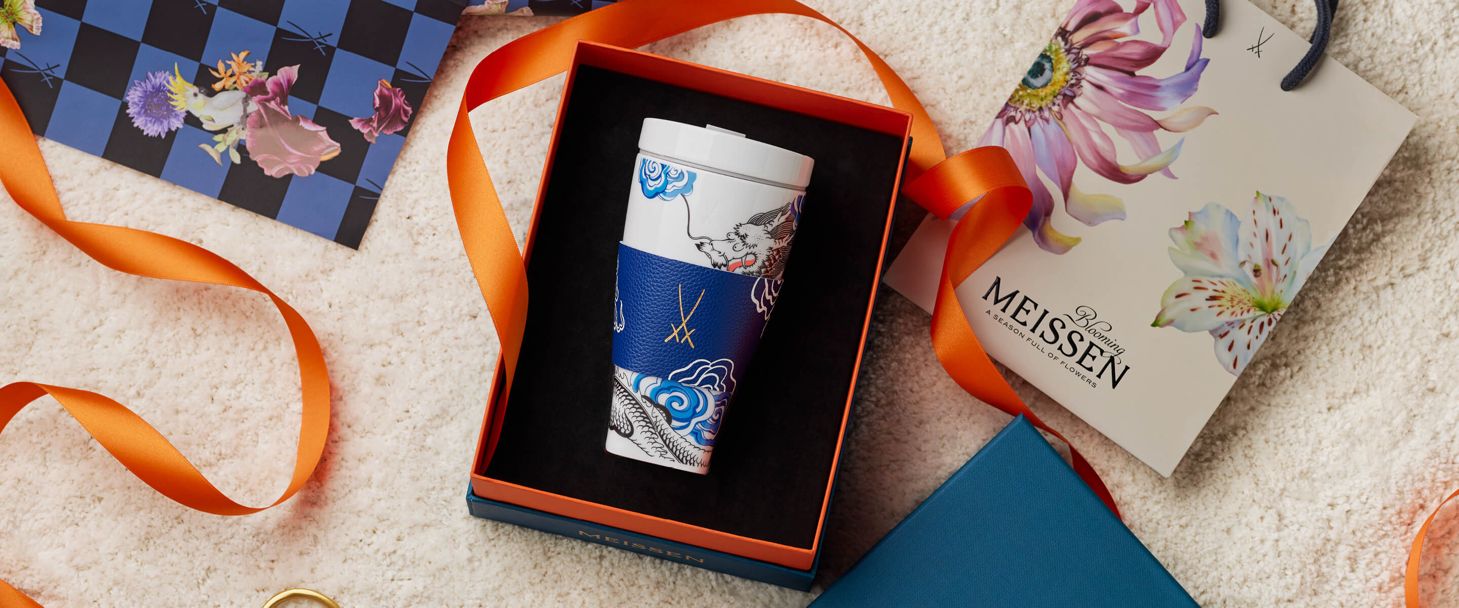 Eines der ersten Dekore, die die Produktdesignerin für den Coffee-to-Go-Becher im Sinn hatte, war das Motiv "Affe & Faultier". Als Inspirationsquelle diente dabei ein bemerkenswertes Stück aus der Geschichte von MEISSEN – eine Vase, auf der die Tiere in blauer Unterglasur dargestellt sind. Die Szene, in der die Tiere an den Bäumen hängen, weckte bei der Produktdesignerin Hou Assoziationen von Erschöpfung, Müdigkeit und dem dringenden Bedürfnis nach Kaffee. Weitere ikonische Dekore, wie das Zwiebelmuster in klassischem Blau oder die Gekreuzten Schwerter in Gold folgten. Anlässlich des bevorstehenden Jahr des Drachens wurde zudem eine Variante mit dem von Hou gestalteten Glücksdrachen vorgesehen.