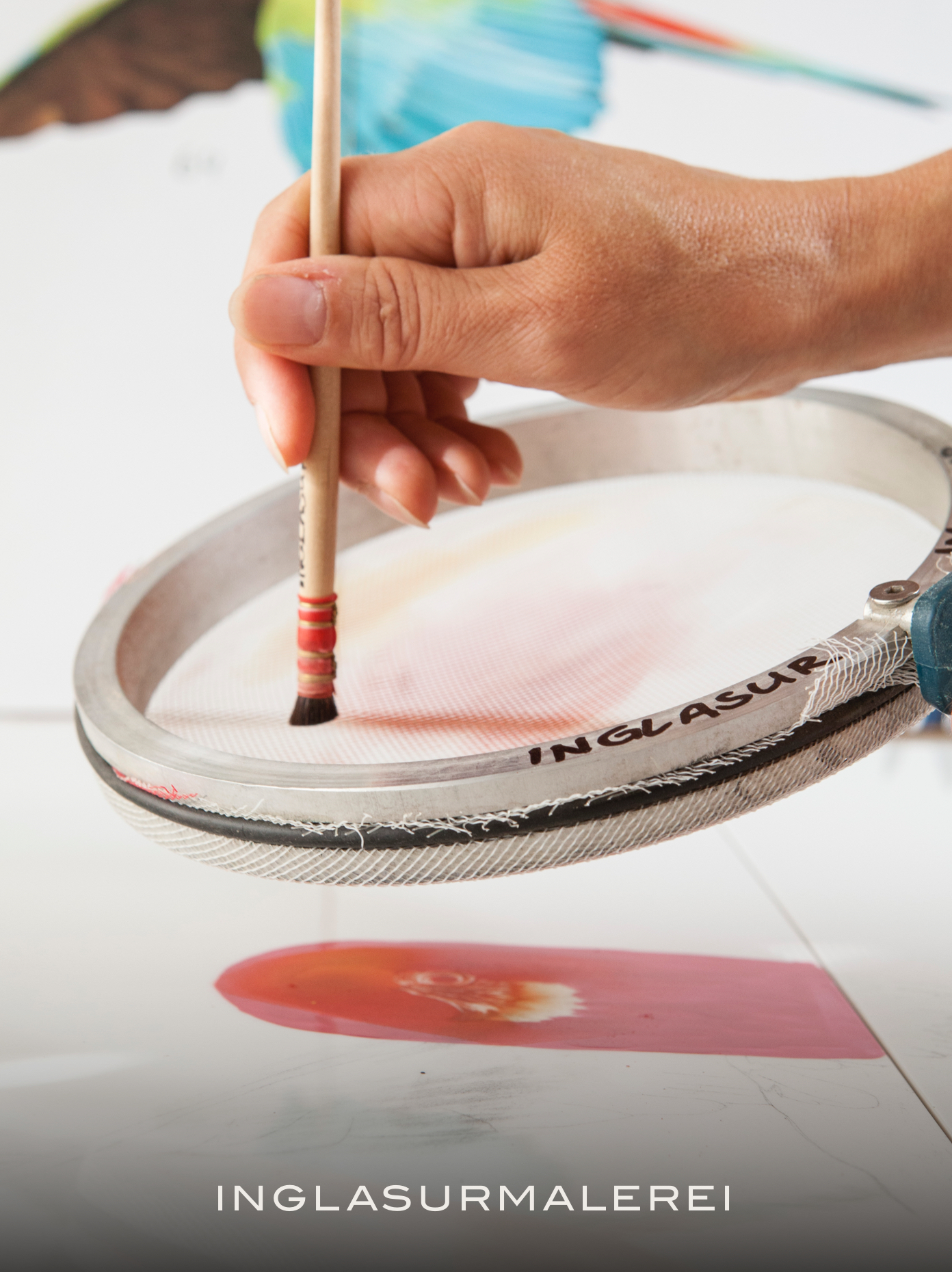 Bei der Inglasurmalerei finden die Farben ihren Weg nach dem zweiten Brand, also dem Glattbrand, auf das Porzellan. Die Farbe sinkt durch den erneuten Brand bei Temperaturen um die bis zu 1500 °C in die Glasur und in den Werkstoff ein und durchdringt diesen großflächig. Entsprechend ist diese Technik für weite Flächen und Hintergründe bestens geeignet.