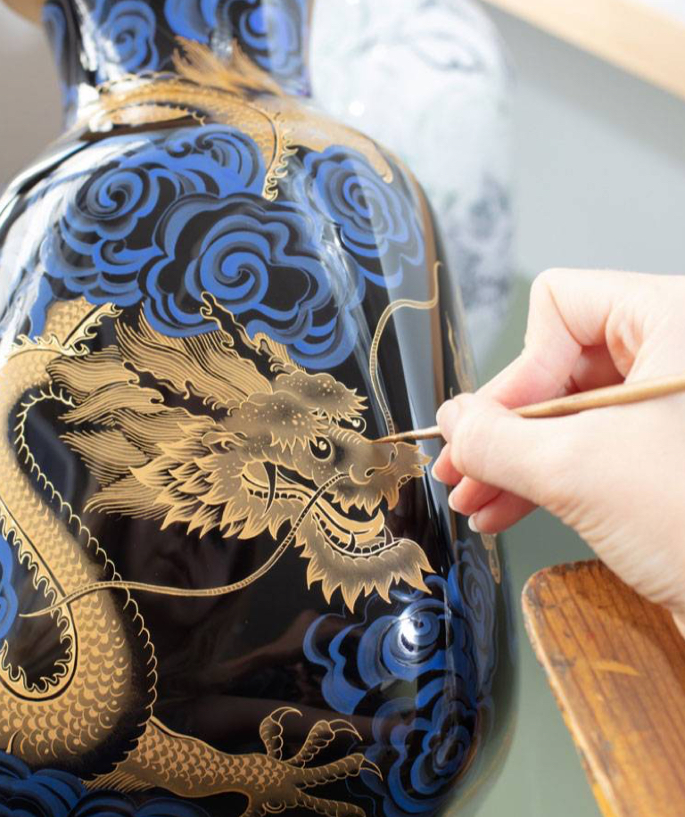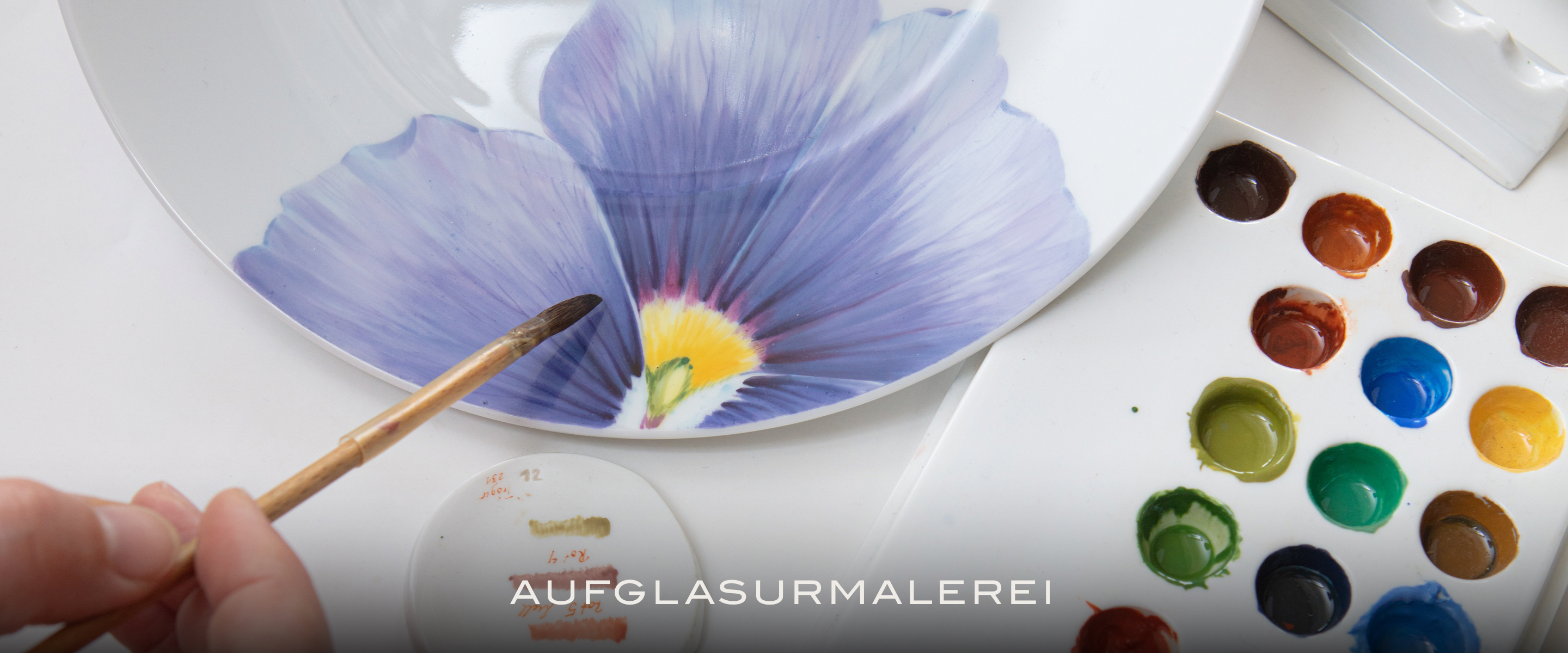 Die Aufglasurmalerei erfolgt im nächsten Schritt auf die glatt gebrannte, ausgeschmolzene Glasur. Da die Brenntemperaturen ab diesem Schritt nur noch bis zu 900 °C betragen, eröffnet sich eine viel größere Farbpalette und schafft die größtmögliche künstlerische Freiheit in der Malerei. Wenn Goldfarben oder weitere Details hinzugefügt werden sollen, muss nach dem Einbrennen der ersten Aufglasurmalerei mitunter sogar noch ein zweiter Brand folgen. Damit hat das fertige Porzellanstück zum Schluss, wenn alle Arten der Porzellanmalerei genutzt wurden, bis zu fünfmal seinen Weg in die Flammen des Brennofens gefunden.