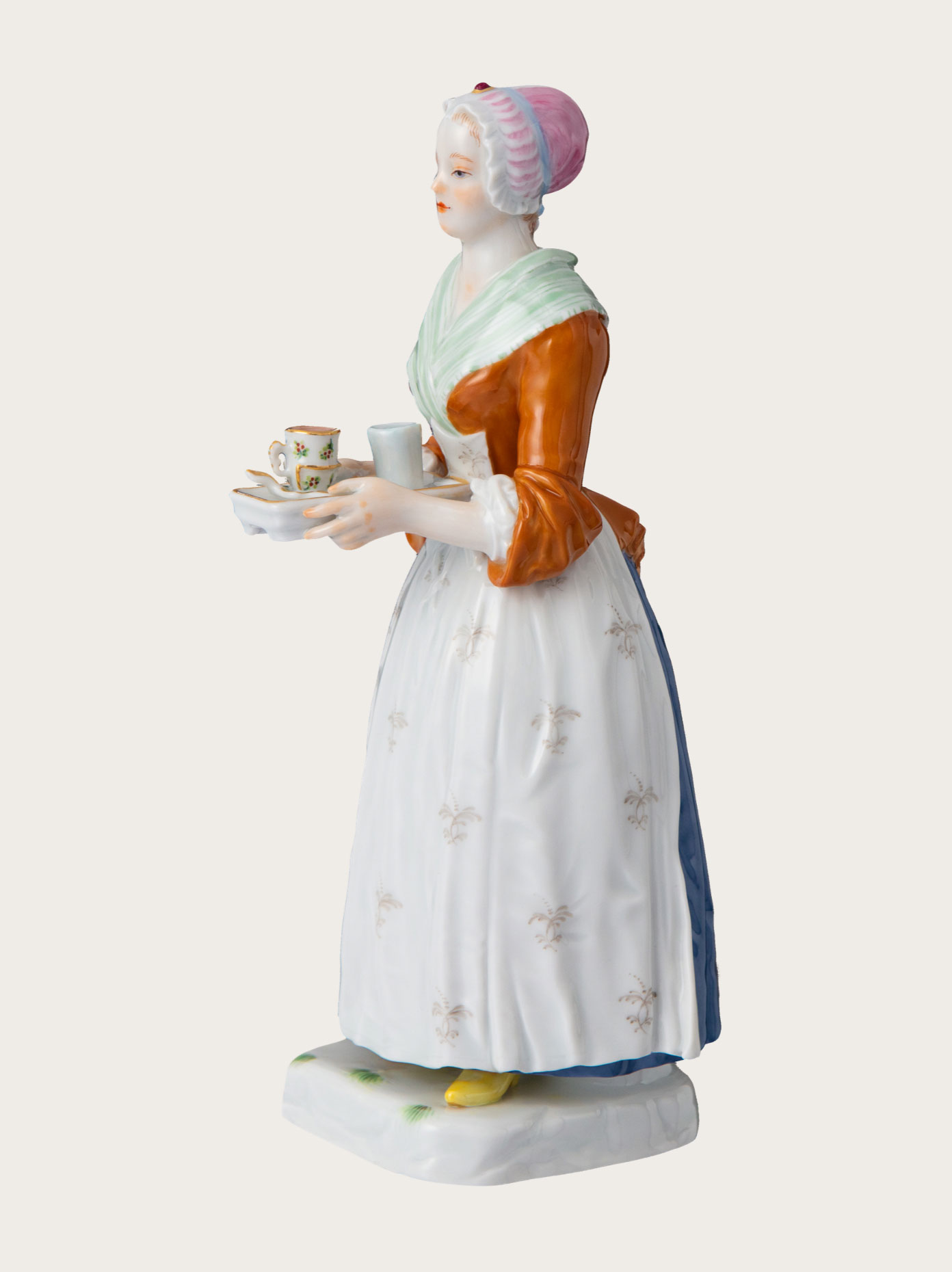 Die einzigartige Darstellung des „Schokoladenmädchens“ diente vielen Kunstschöpfern als Inspiration, so auch den Meissener Künstlern. 1835 erweckten diese das Gemälde mit einer atemberaubenden Porzellanfigur zum Leben und wie im Originalwerk von Liotard dominieren auch in der Meissener Figur zarte Pastellfarben. Der für die Zeit typische glockenförmige Rock des Mädchens und ihr zartes Häubchen sind in feinen Pastelltönen gehalten. Durch das Hinzufügen von fein weich gemalte Blumenornamente der Schürze verleiht MEISSEN dem „Schokoladenmädchen“ einen ganz eigenen Touch. Die Figur wird aus insgesamt 12 Formen zusammengesetzt. Bei der Staffage erhält sie ihren freundlichen Gesichtsausdruck und ihre fein ausgearbeitete Garderobe. Um beispielsweise die Falten im schönen blauen Rock exakt darzustellen, sind zwei Brenndurchgänge mit anschließender Bemalung notwendig.