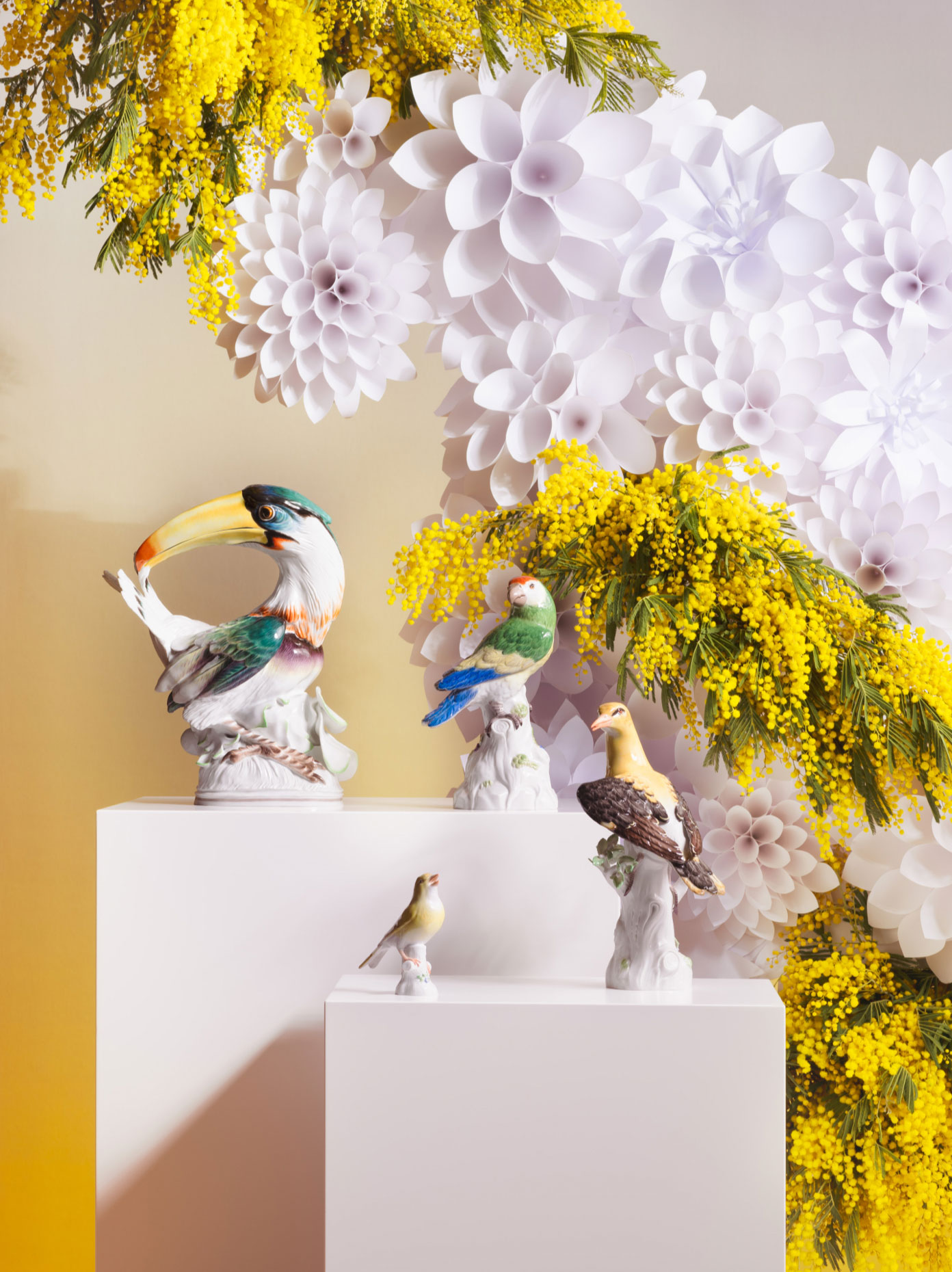 Eines der beliebtesten Themen der Meissener Porzellanmodelleure ist und war auch schon immer die Welt der Vögel. Dabei ließen sich die Modelleure nicht nur von einheimischen Vögeln inspirieren. So hatte Kaendler beispielsweise mit dem Papagei, dem Kanarienvogel oder vielen anderen Vertretern der Avifauna eine Vielzahl exotischer Vogelarten in naturgetreuen, detailverliebten Darstellungen angefertigt, die auch aus der exotischen Vogelwelt stammen. Doch auch andere Modelleure haben sich mit beeindruckenden Werken einen Namen gemacht. So gilt Paul Walther (von 1904 bis 1933 für MEISSEN tätig) mit seinen 196 erstellten Modellen als einer der produktivsten Modelleure. Zu seinen Werken gehören unter anderem der Edelreiher oder der Tukan. Und auch der bekannte Plastiker Jörg Danielcyzk (von 1969 bis 2018 für MEISSEN tätig) schuf wahre Meisterwerke in Vogel-Form, wie unter anderem den beeindruckenden Weißkopfseeadler.
