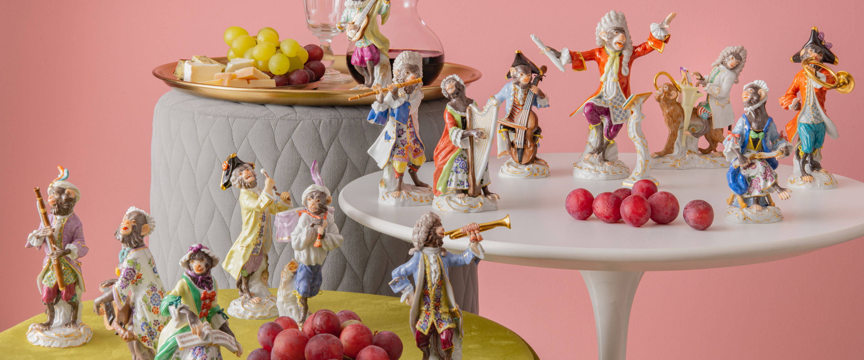 Das vermutlich populärste Figuren-Ensemble stellt die von Kaendler entwickelte Affenkapelle dar. Aber auch der von ihm modellierte Mops ist eine echte Berühmtheit in der Porzellan-Menagerie von MEISSEN, die heute in vielen verschiedenen Varianten als Mops-Figur oder Mops-Anhänger verfügbar ist. Er ist ein Symbol der Treue und wurde ursprünglich als Geschenk von August dem Starken für seine Geliebte Anna Constantina, Reichsgräfin von Cosel, als Zeichen der Liebe in Auftrag gegeben.