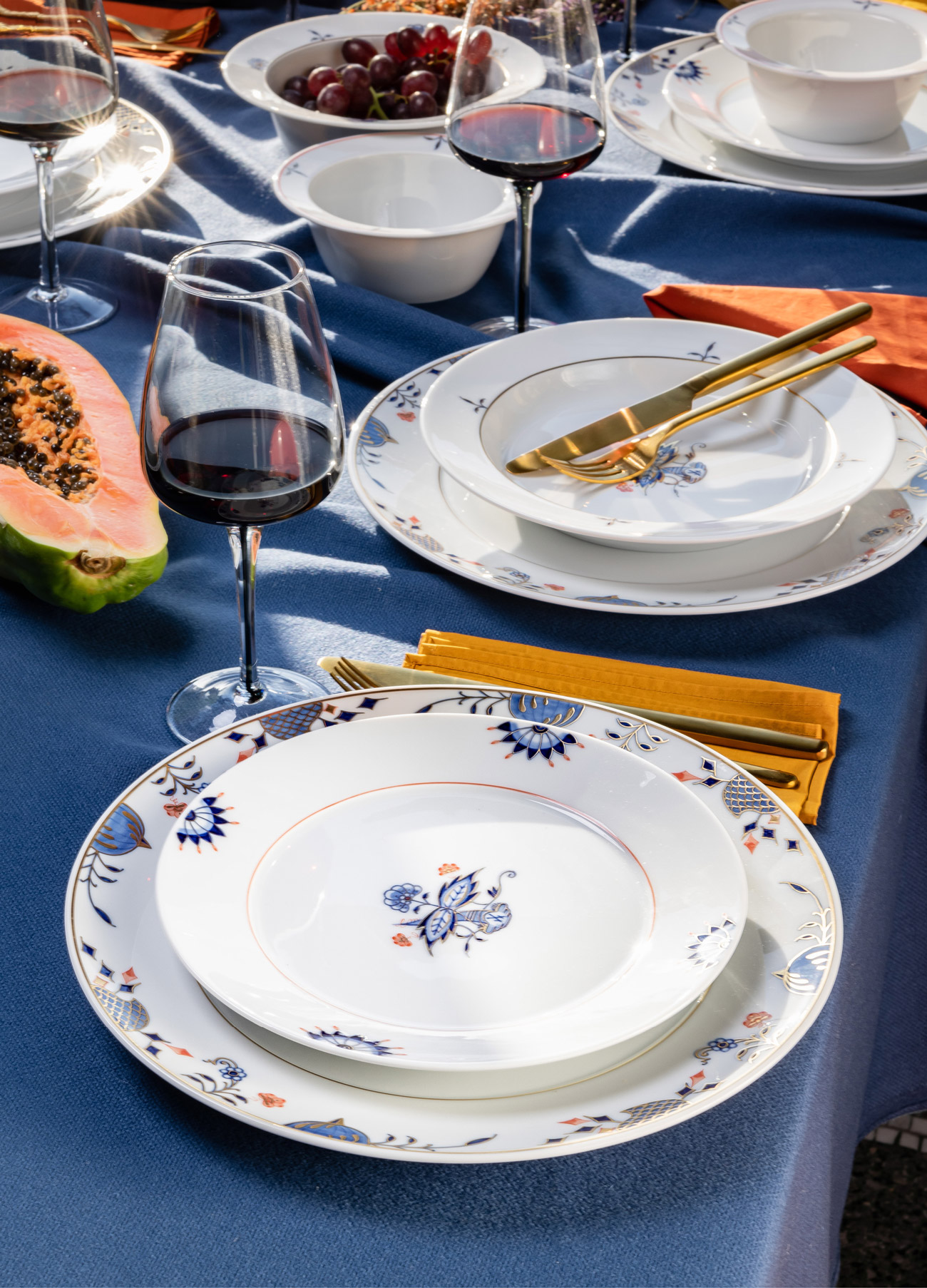 Noble BlueIn „Noble Blue“ widmet sich MEISSEN einem ihrer berühmtesten Dekore, dem ikonischen „Zwiebelmuster“, welches ab 1731 in der Manufaktur entsteht. Inspiriert von ostasiatischen Porzellanen jener Zeit zeigt es tatsächlich keine Zwiebeln, sondern exotische Früchte und Blüten. Deren Anordnung innerhalb des Dekors liegen fest. In „Noble Blue“ werden jene klassischen Elemente nun aufgegriffen und erstmals neu arrangiert. Ihren Platz finden Sie auf der puristischen Form „N°41“.