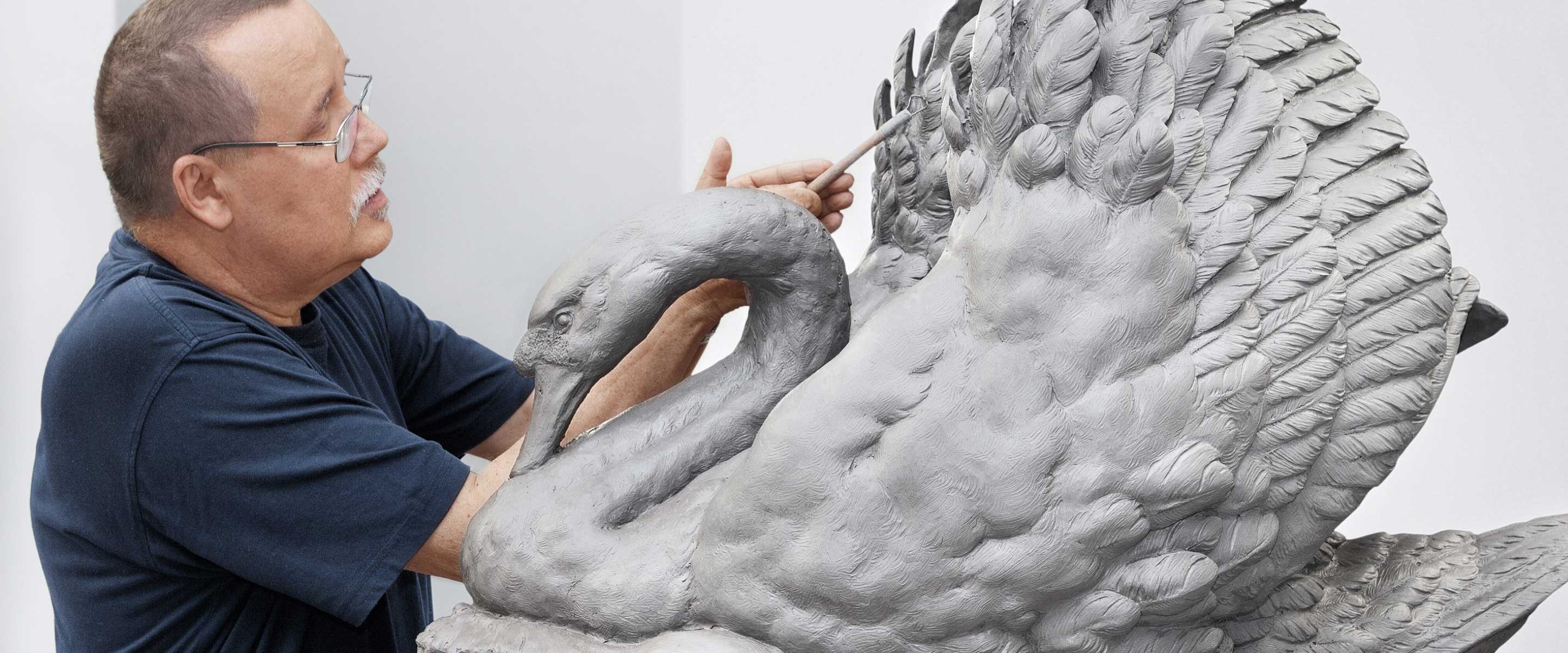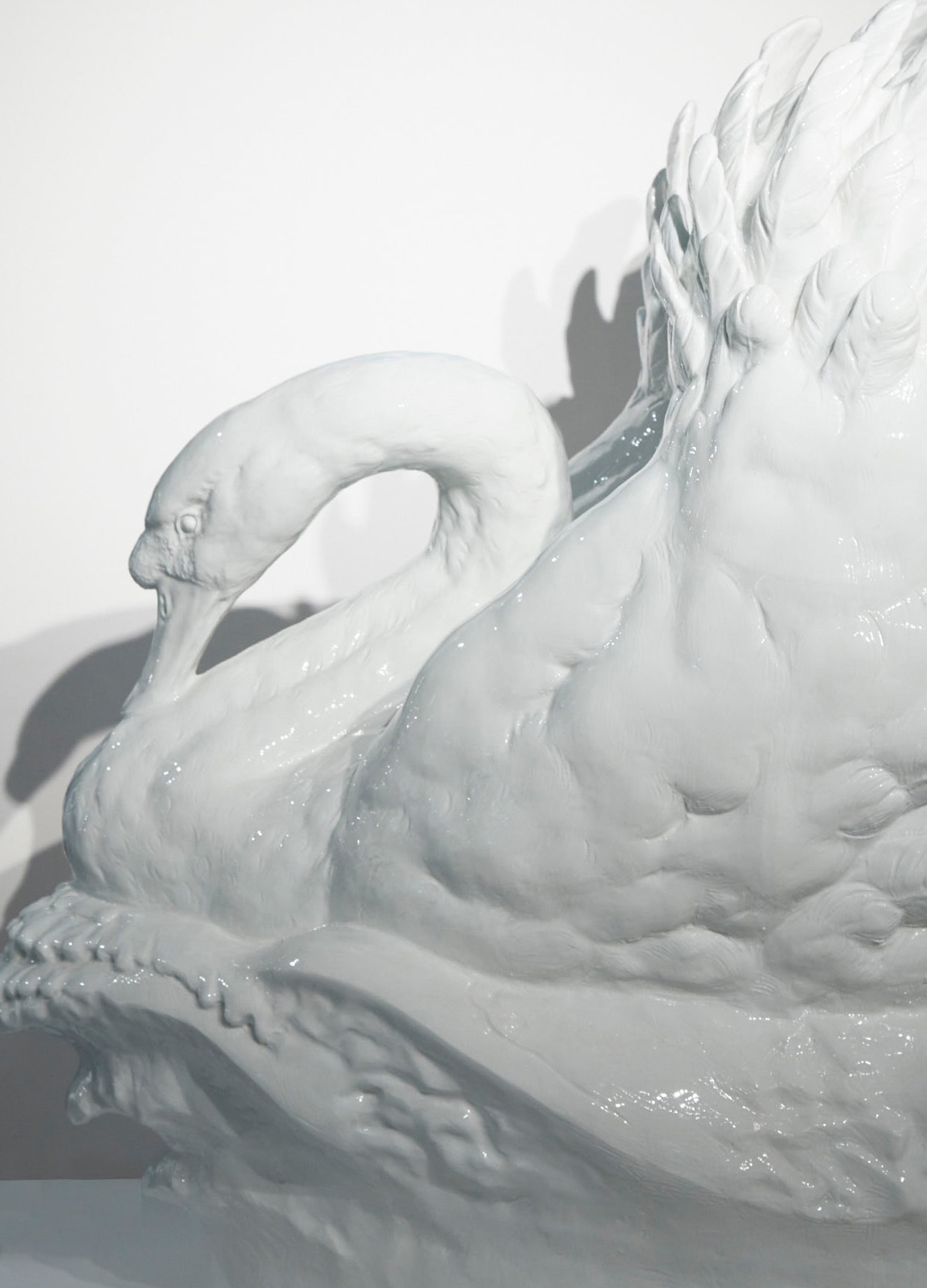 SchwanAnlässlich des 275. Jubiläums des Kaendler‘schen „Schwanenservice“ wird die Großplastik eines Schwans im Jahr 2012 vom ehemaligen Meissener Chefplastiker Jörg Danielczyk modelliert. Die Skulptur verweist in ihrer geschwungenen Formensprache des Barocks auch auf das zweite große Erbe Kaendlers – die berühmten Großtierplastiken für das Japanische Palais in Dresden. Wie sie ist der Schwan bewusst weiß belassen, um die Bildsamkeit des Porzellans zur Geltung zu bringen. Meisterhafte Akzentuierungen zeigen sich in der detailreichen Modellage des Gefieders. Die Herstellung einer solchen Großplastik stellt die Meissener Bossierer heute vor die gleichen Herausforderungen wie im 18. Jahrhundert: Das Innere der Figur wird mit Kammern ausgestattet, die als architektonisches Grundgerüst dienen. Sie müssen die Form erhalten, wenn das Porzellan im Hochofen zunächst weich wird. Eine Assemblage, die jahrelanger Erfahrung bedarf. -