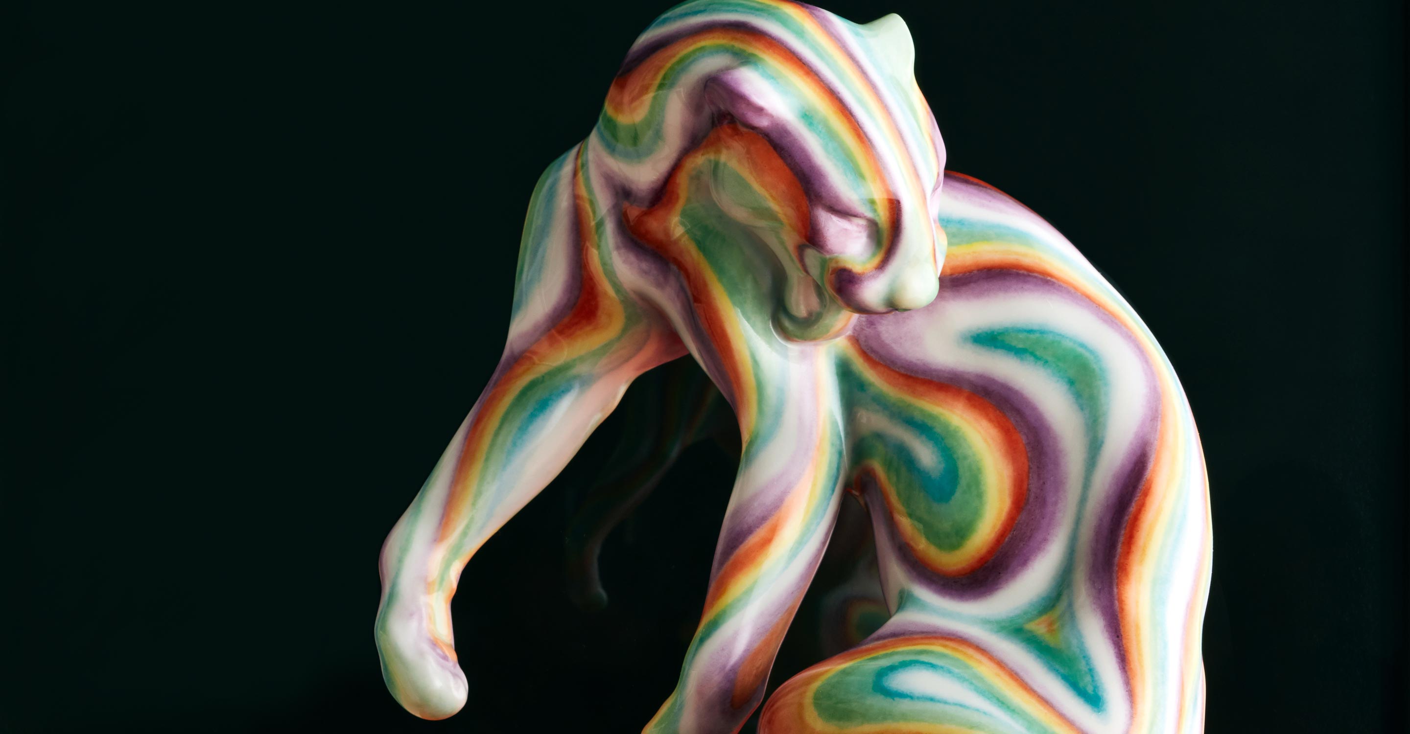 “Rainbow Panther” is Creative Director Otto Drögsler’s high-contrast reinterpretation of the historic sculpture by Erich Oehme. The lively rainbow pattern is created through an expert combination of painting and stippling with extremely fine brushes and rounded out in multiple firings.