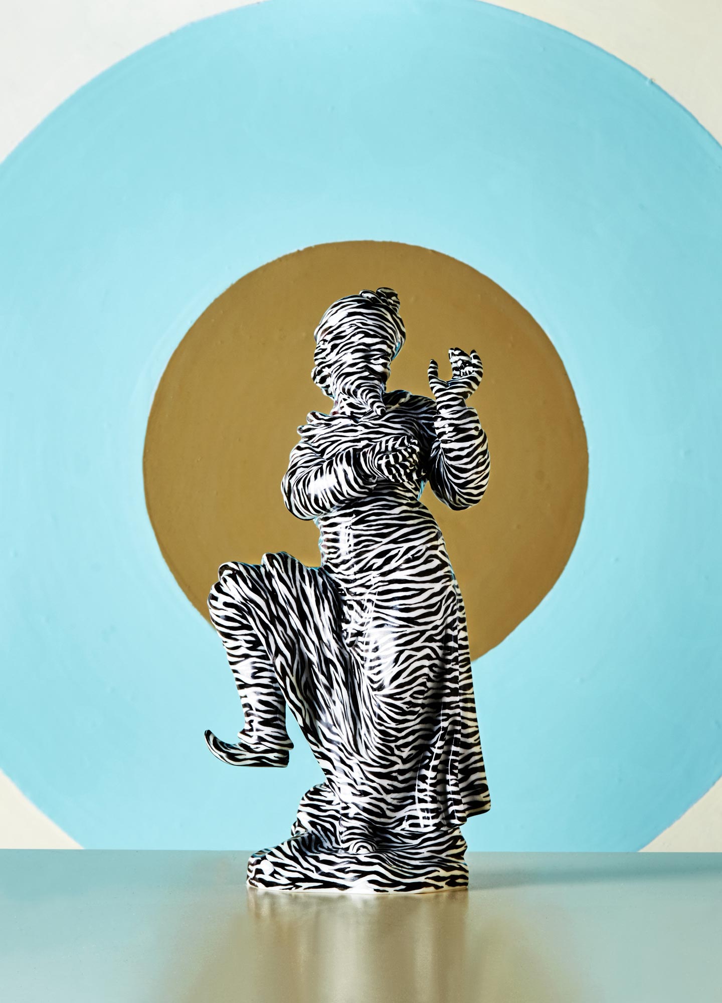 Japanese Figure dancing with Zebra LookThe marriage of historical figures and contemporary styles has taken place throughout Meissen’s history since its founding. By covering Peter Reinicke’s “Japanese Dancer” from 1743 in a zebra pattern, Creative Director Otto Drögsler has consciously decided to pursue contradiction. Fine lines in a variety of black and grey tones are applied with a great deal of artistic skill, carefully hugging the dynamic curves of the figure; not a single line is interrupted. Contrary to the tradition of highlighting clothing and gestures through realistic painting, the pattern on this figure allows a number of structural details to recede into the background. As a result, the dancer appears to us as almost a silhouette. The figure’s decor represents the invisible interplay of conflicting cultures: zebra print is nowhere to be found in the traditional Japanese catalogue of colours and patterns. -