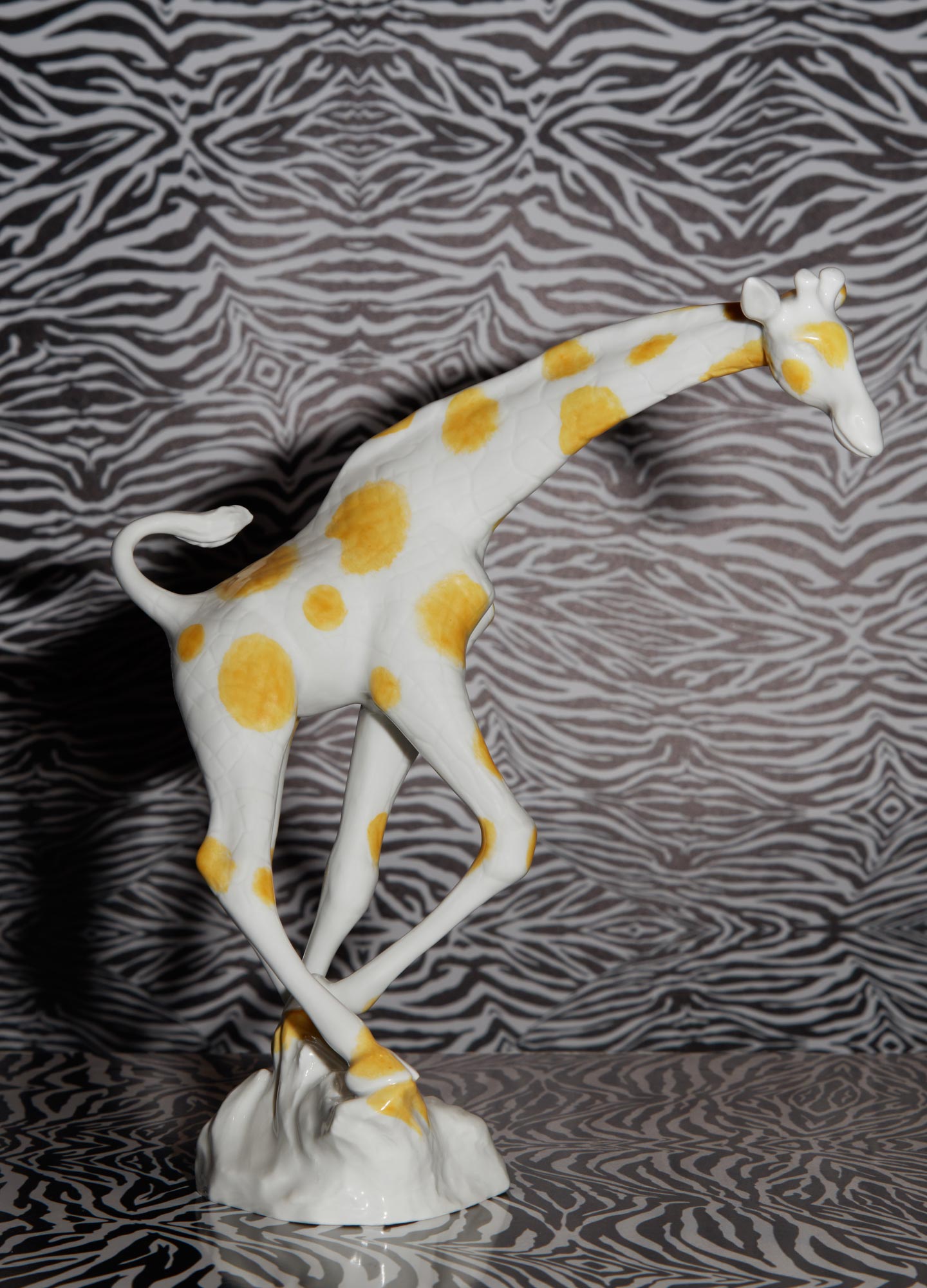 Pop Giraffe“Pop Giraffe” is a contemporary interpretation of a Meissen animal sculpture from 1955. The golden-orange decor is reminiscent of naturalistic giraffe prints, however, upon closer inspection, reveals itself as an abstract, Pop Art-inspired variation on this pattern. Within the production of this figurine, the challenge lies in the tall, lanky nature of the giraffe: the hooves of the animal, which is captured here in motion, barely touch the base; necessitating a great deal of skill and expertise to ensure that the figure does not buckle during firing.