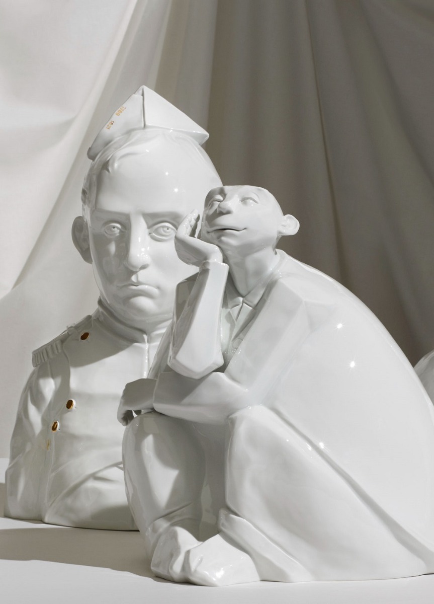 With her interpretation of the Three Wise Monkeys, Maria Walther has created an expressive depiction in the tradition of Meissen animal statuary. With no naturalistic template, the detailed camouflage pattern – a nod to the sculptures “see no”-symbolism – requires the utmost in abstract thinking.