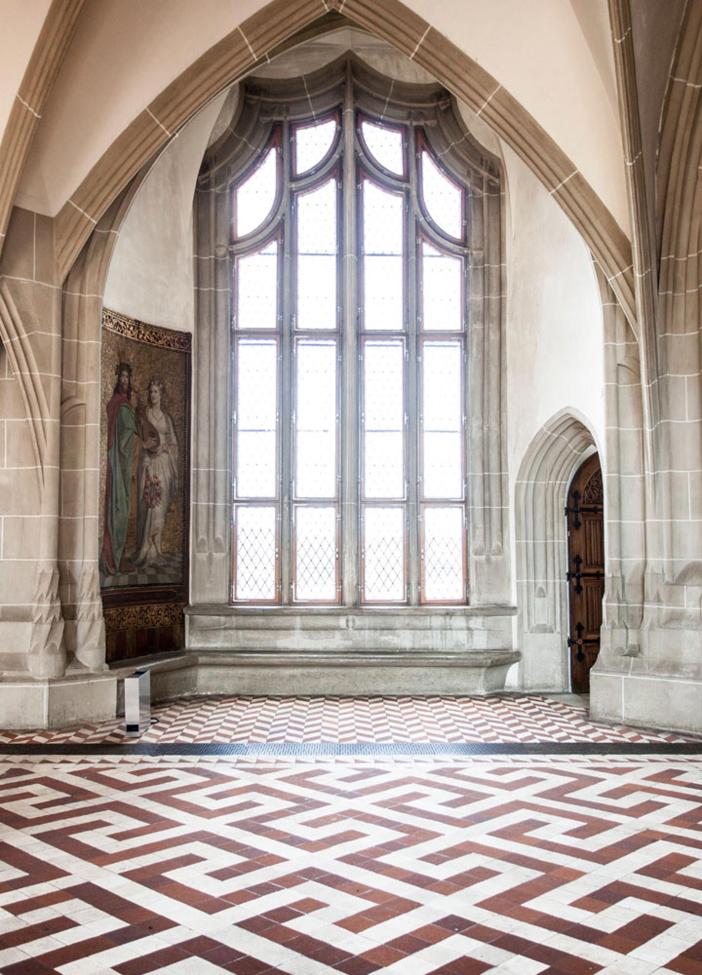 The fresh turquoise colour highlights the modern, geometric character of the “Royal Palace” pattern and firmly anchors its historic counterpart in the present day. Delicate red contours highlight its accuracy and allow the turquoise to appear even more radiant.