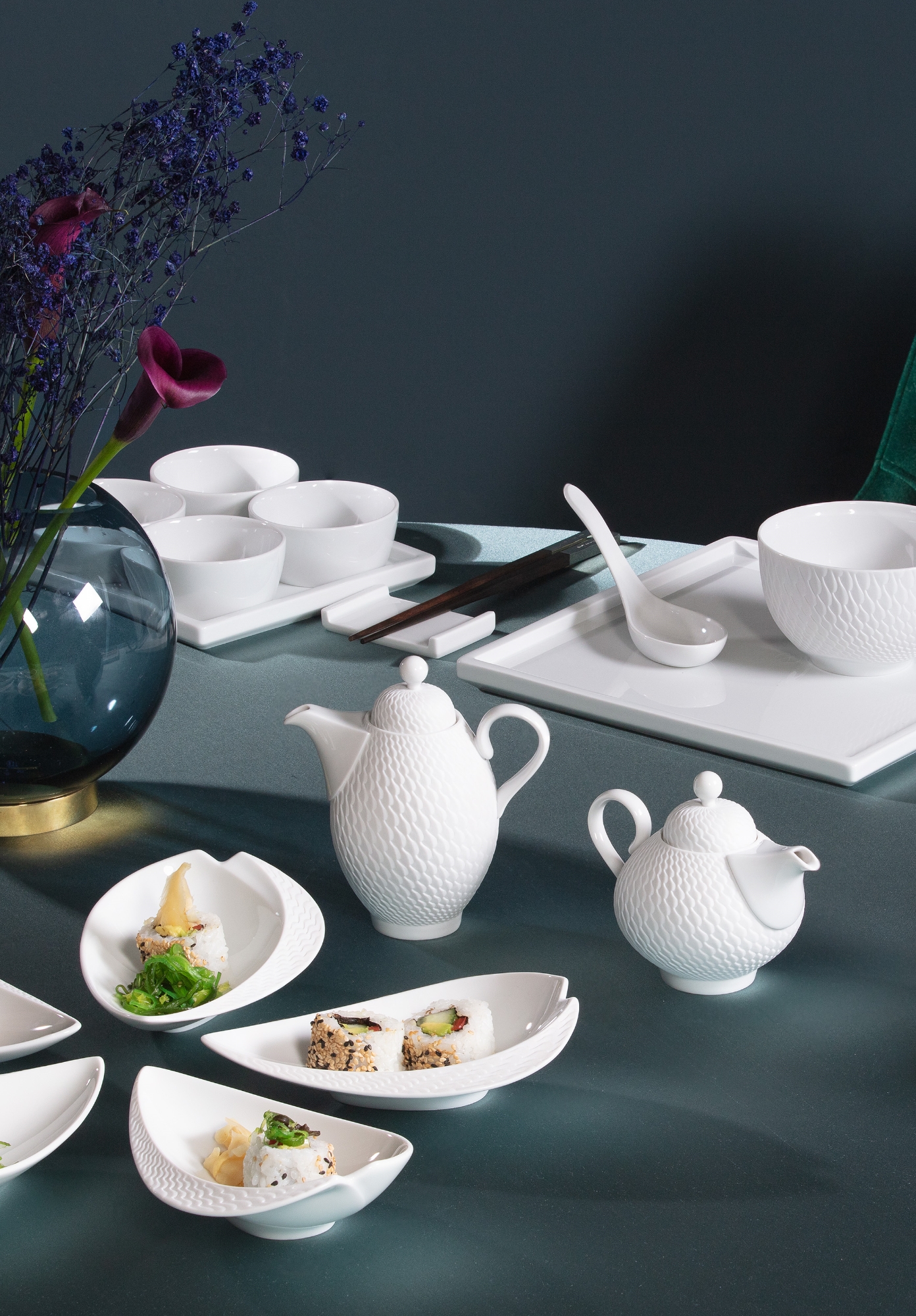 The perfect service for lovers of the Asian cuisine with a sweeping waves relief for a maritime flair.