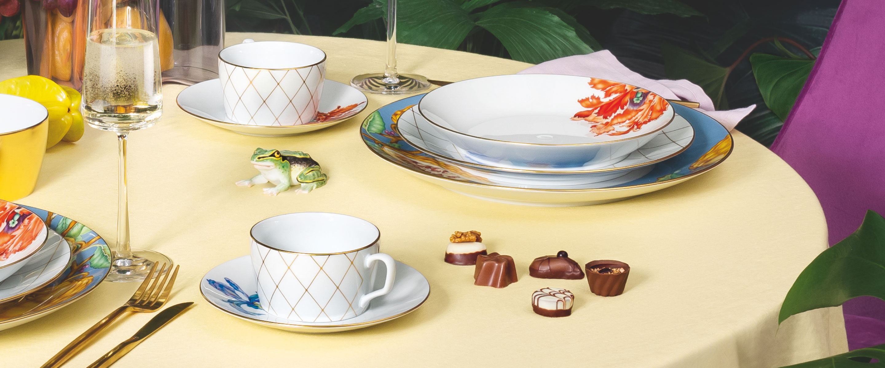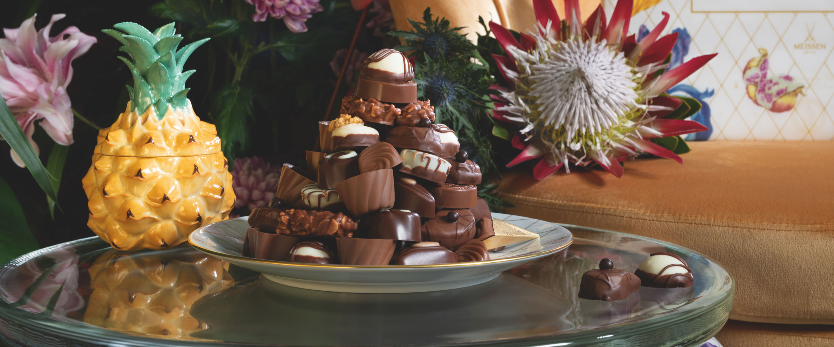 We from the porcelain manufactory MEISSEN also celebrate the delicious pleasure of the senses on every occasion. Thus, the collaboration with the Swiss chocolate manufacturer Lindt shines in full glory, on the occasion of pure joie de vivre and unrestricted enjoyment. The exclusive special Lindt x MEISSEN edition of HOCHFEIN pralinés and the matching unique porcelain series present a fascinating, exotic décor consisting of golden cocoa fruits, lush feather poppy blossoms, delicate iris flowers and juicy figs. Here, the "brown gold of the Aztecs" and the "white gold of the Saxons" unite in harmony and inspire our wildest chocolate dreams.