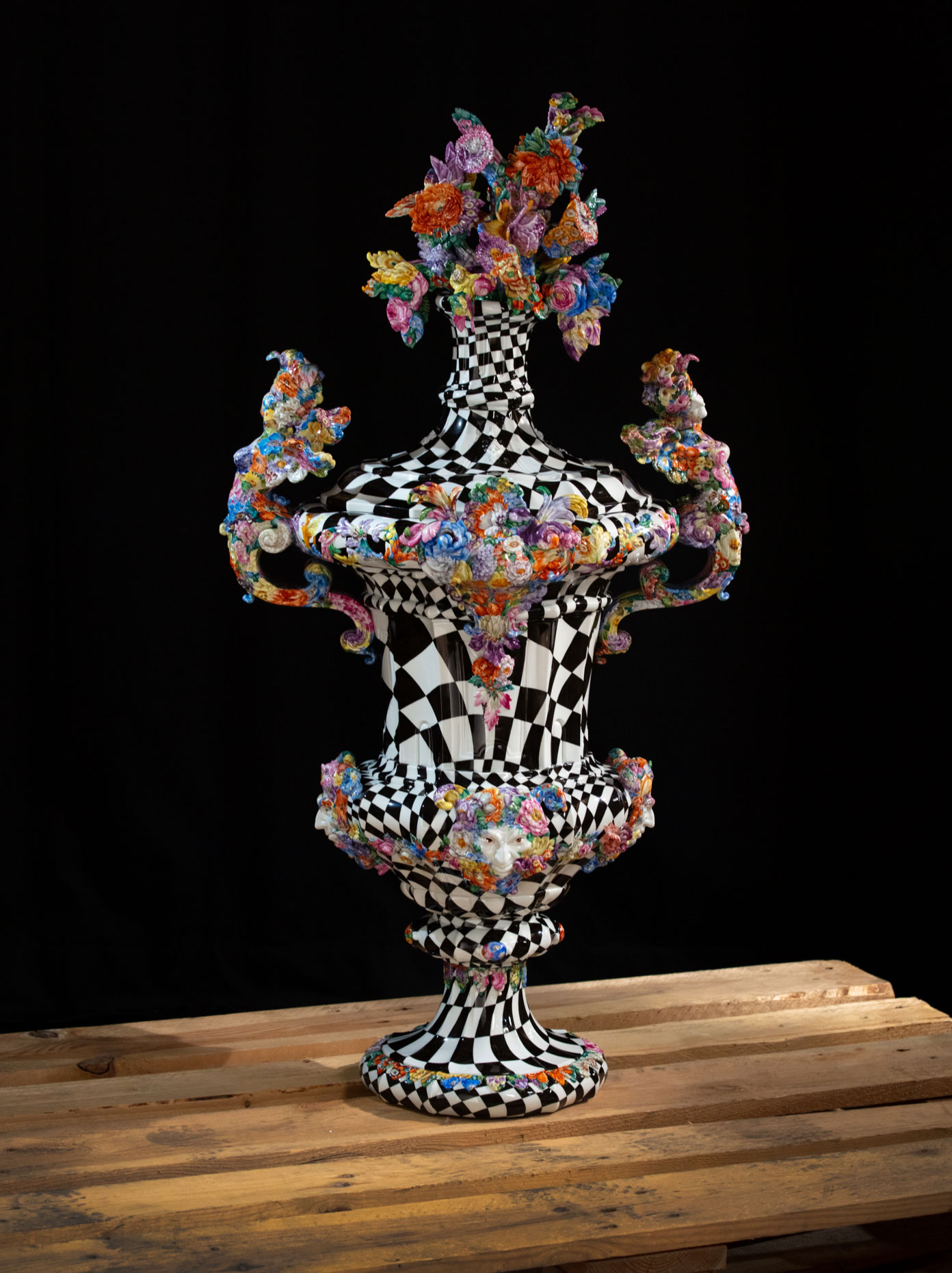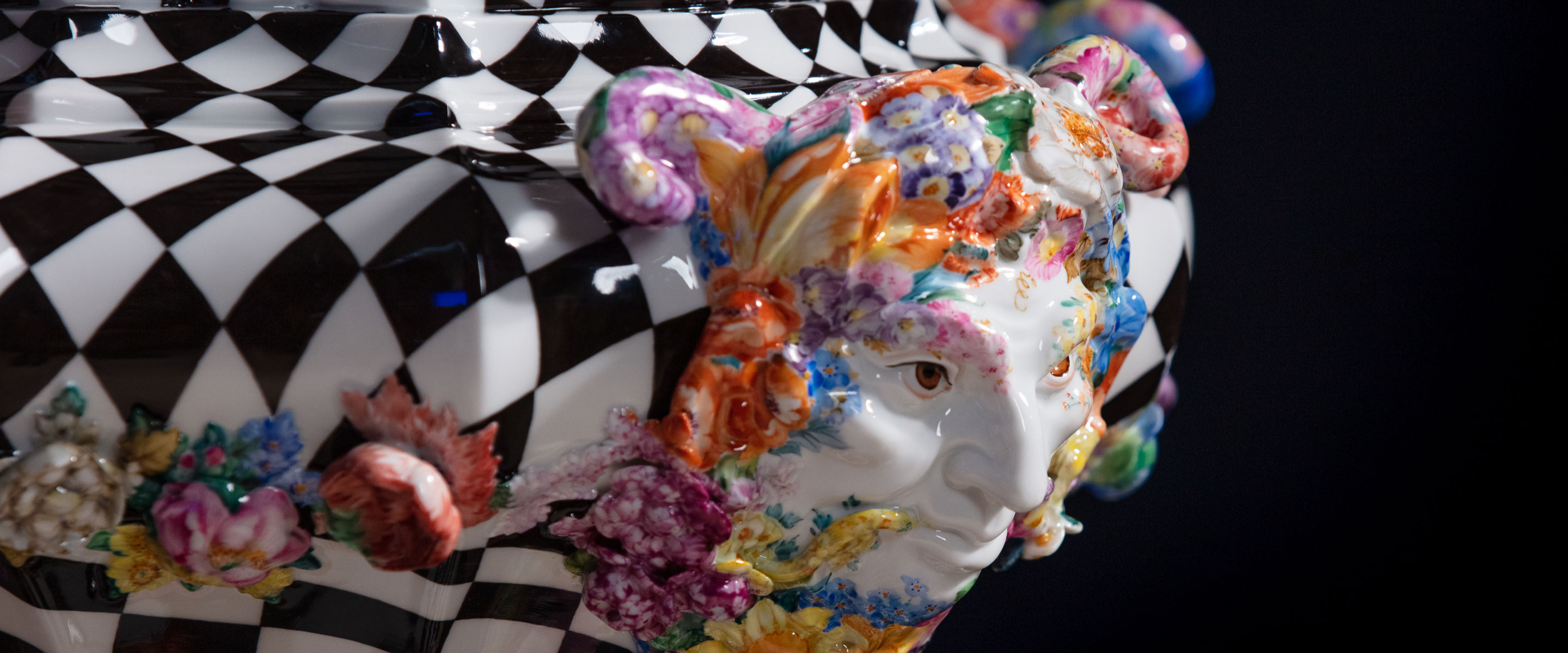 A true masterpiece of embossing art, the magnificent vase form now impresses with floral tendrils, female herms and mascarons adorn the handles. The historic body of the vase is excitingly flattered by the dynamic design. Two opposing design principles collide: the checkerboard motif and colorful floral tendrils as a bright camouflage pattern. The flowers seem boundless and deliberately ignore the plastic reliefs to create a surreal as well as lively expression. It is a high art to veil plastic elements so masterfully and deliberately not follow the form.
