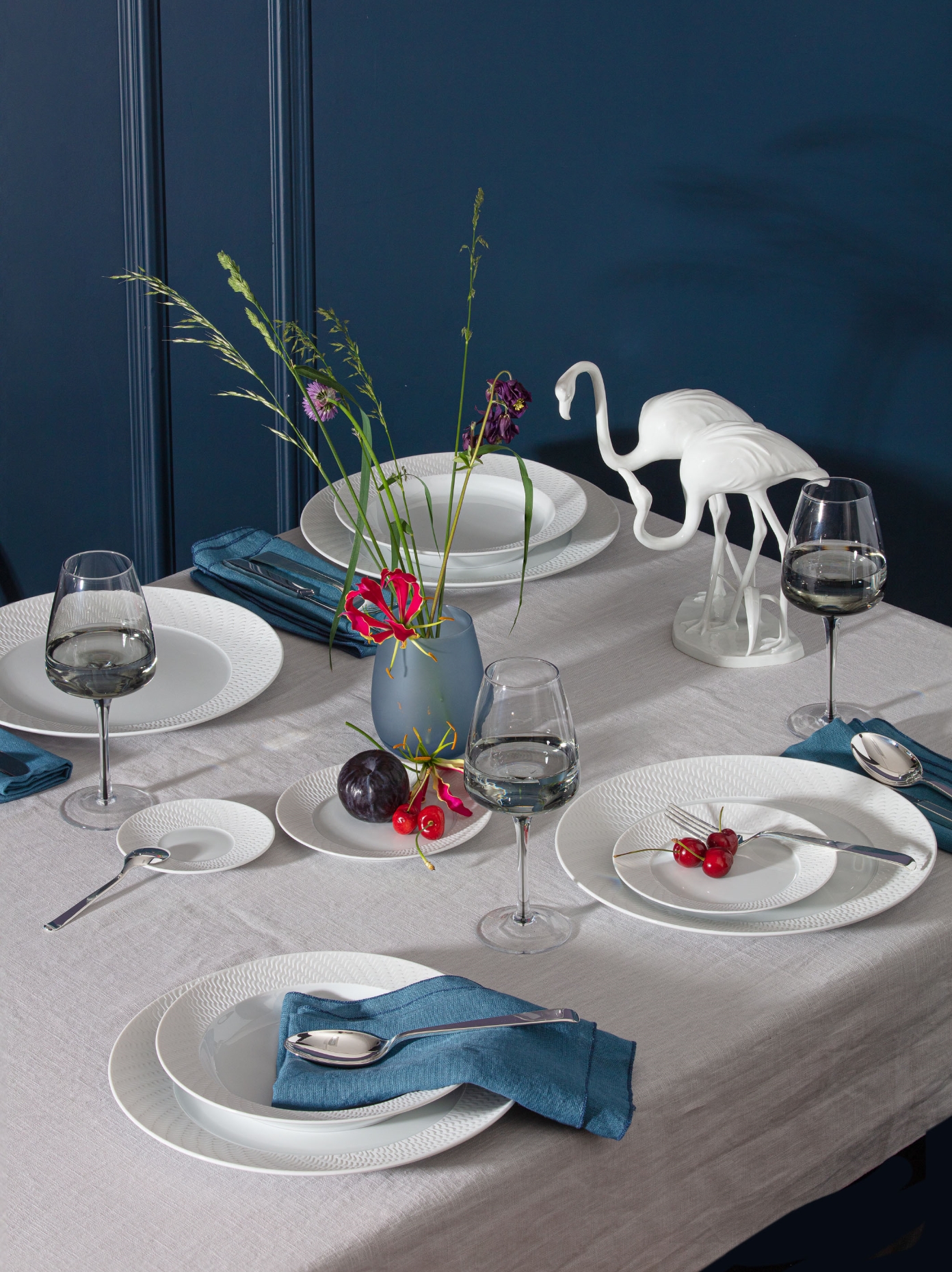 But traditional floral painting was not the only genre to be given a new lease of life and brought into the here and now. Two other contemporary interpretations this year were the cobalt blue painting of the world-famous "Onion Pattern" and the sweeping waves of our popular "Waves" collection, which were reinterpreted on the modern "N°41" shape.