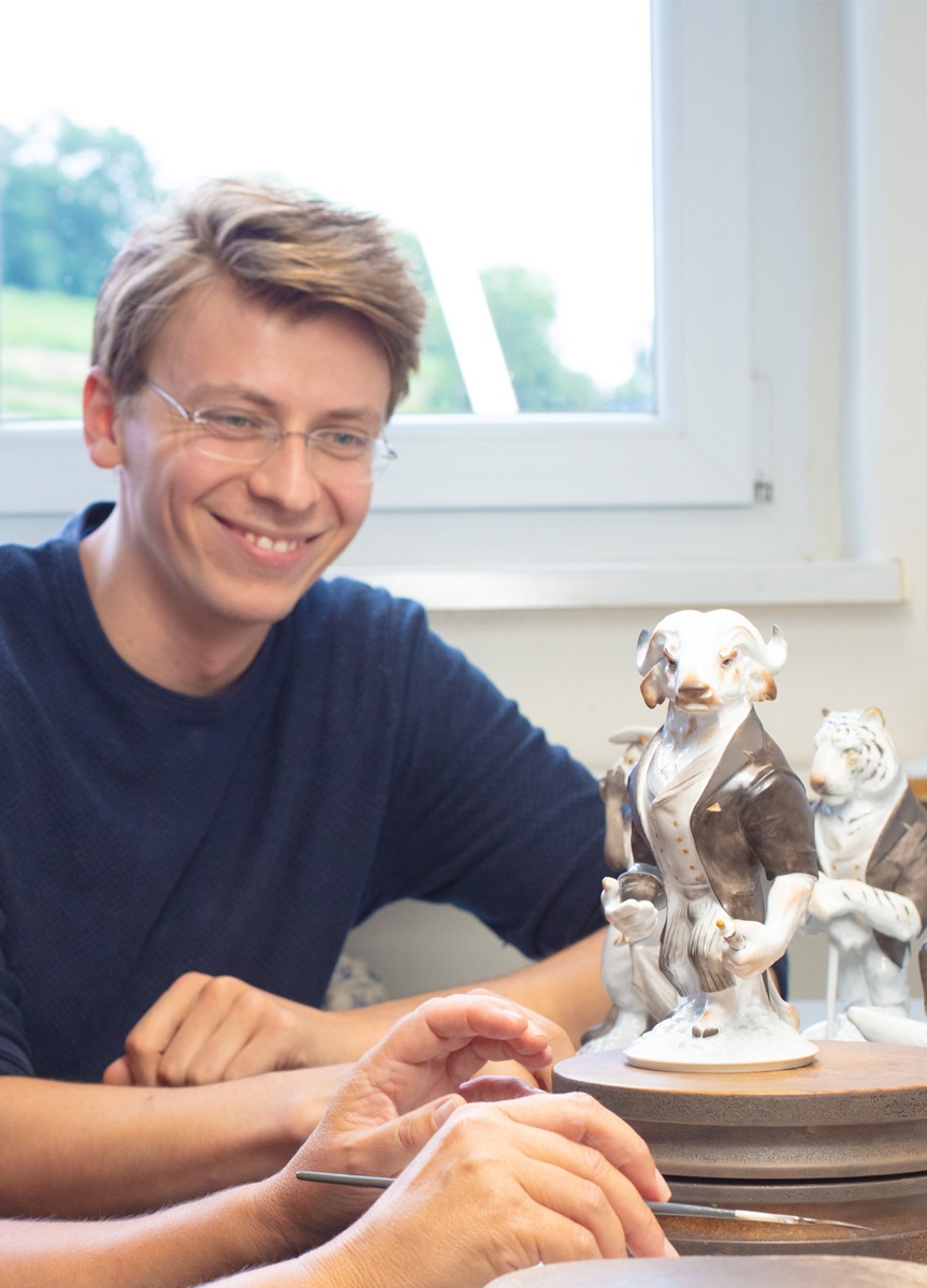 The Meissen sculptor, who trained under Jörg Danielczyk, was already enthusiastic about painting and sculpture during his school years. At the age of 16, he therefore began training as a porcelain painter at the Meissen manufactory and is still an enthusiastic artist at the manufactory today. For Maximilian Hagstotz, the special charm in the design of his sculptures lies in what is hidden, whether a hidden element or an initially unconventional-looking design of the work of art. It is only through the viewer, who places his gaze on the figure and explores it in its perfect splendor, that the full beauty and deeper meaning of the sculpture emerges.