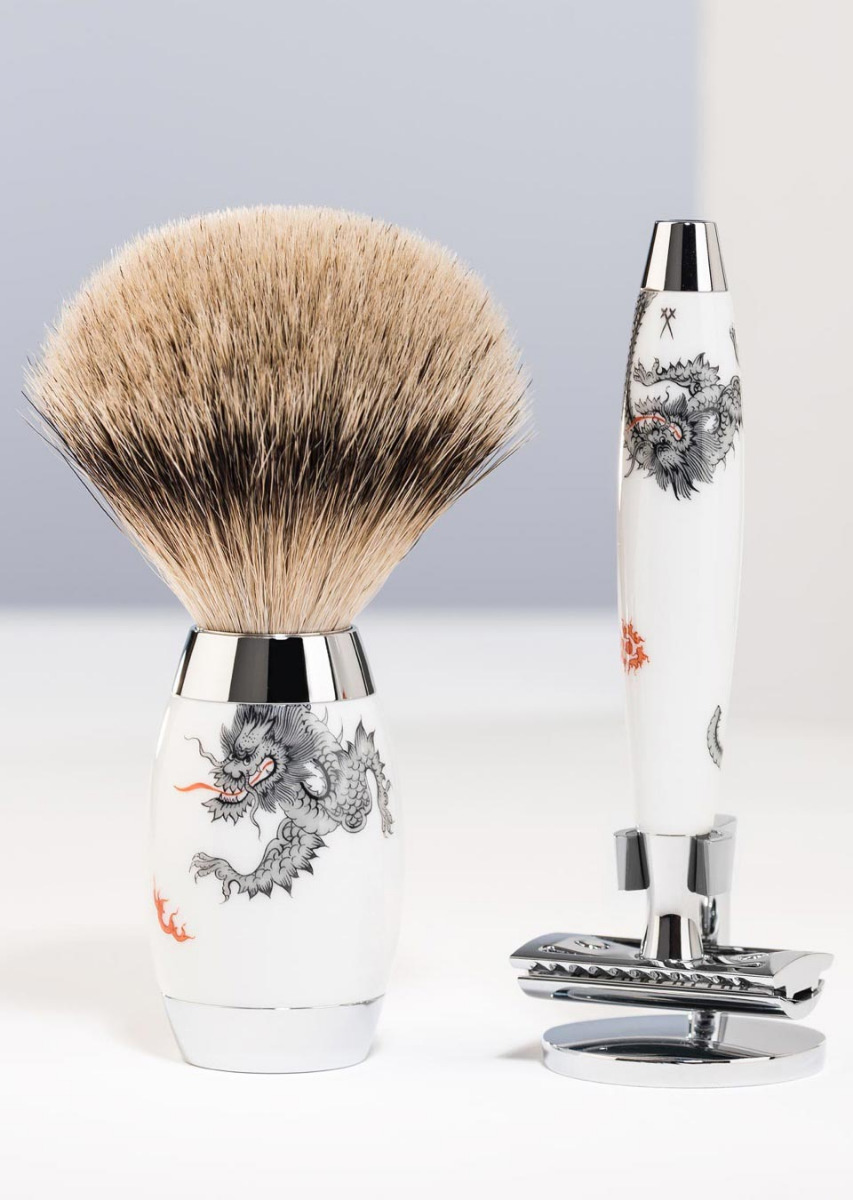 With the "VITRUV" service form, MEISSEN defines a completely new design language for table and dining: straightforward, clear and puristic. Since the beginning of the manufactory, Meissen artists have always freely quoted architectural trends and elements in unusual decors and shapes. "VITRUV", inspired by one of the main elements of architecture, the column, continues this tradition - an architectural production in porcelain, whose design and craftsmanship sophistication is reflected in accurate details. The oval shapes such as the pot, cup and sugar bowl are a special feature: They take on something weightless thanks to the hand-applied foot with a groove milled above it, defining an entirely new aesthetic in the manufactory's repertoire. "Graphic", a specially developed relief translates the formal language into a graphic pattern that appears in different variations. Similar to reflecting prisms, they lend the porcelain a schematic structure and exciting haptics. The Ming Dragon, one of the manufactory's most popular designs, was created around 1910 and was inspired by Asian models. A harmonious re-interpretation can now be found in the VITRUV service and the "Ming Dragon" decor in elegant black. Dynamically placed on appetizer and dessert plates in detailed hand painting, it lends the clear form a sublime character and underscores the timelessness of the design. Supporting the modularity of the service, its puristic design offers manifold possibilities for arranging. The porcelains with the Graphic pattern in white glaze or partially in cookie can be combined with each other and complemented with the Ming dragon décor to stage the VITRUV service form according to the respective room and occasion. The service consists of 24 pieces, except for the hand-painted Ming Dragon decor, all pieces are dishwasher safe.