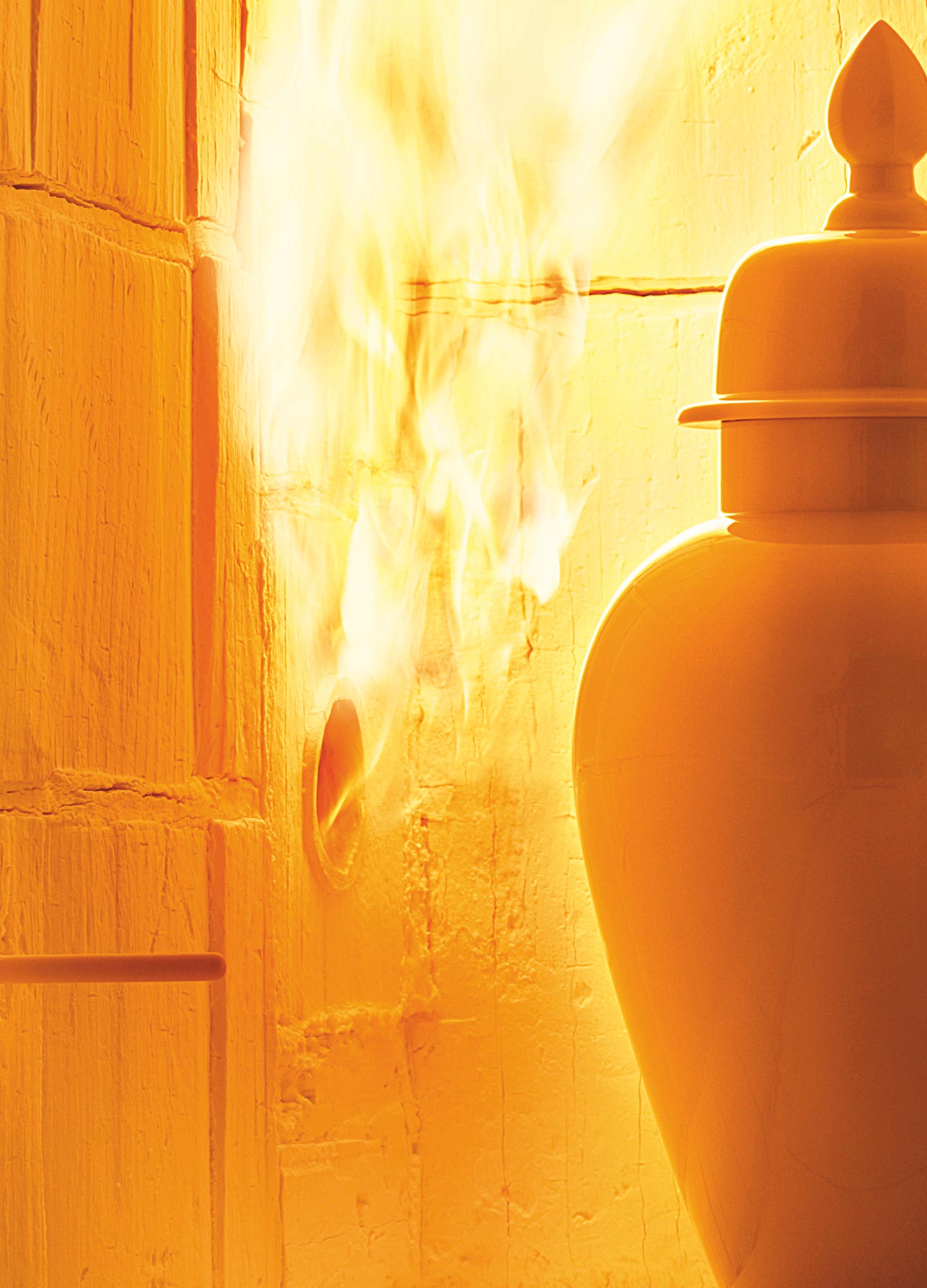 Glost FiringSingle-fired porcelains receive their all-important finish in the rose-coloured glaze baths – or spray booths in the case of delicate figurines. The subsequent glost firing occurs at up to 1.400° C and can last up to six days. It is during this time that the glaze fuses with the porcelain, which also shrinks by roughly one sixth of its original size. The composition of the porcelain paste and the firing technology must be optimally coordinated in order for the final product to exhibit the special strength, pure white colour, and brilliant lustre for which Meissen porcelain is famed the world over.