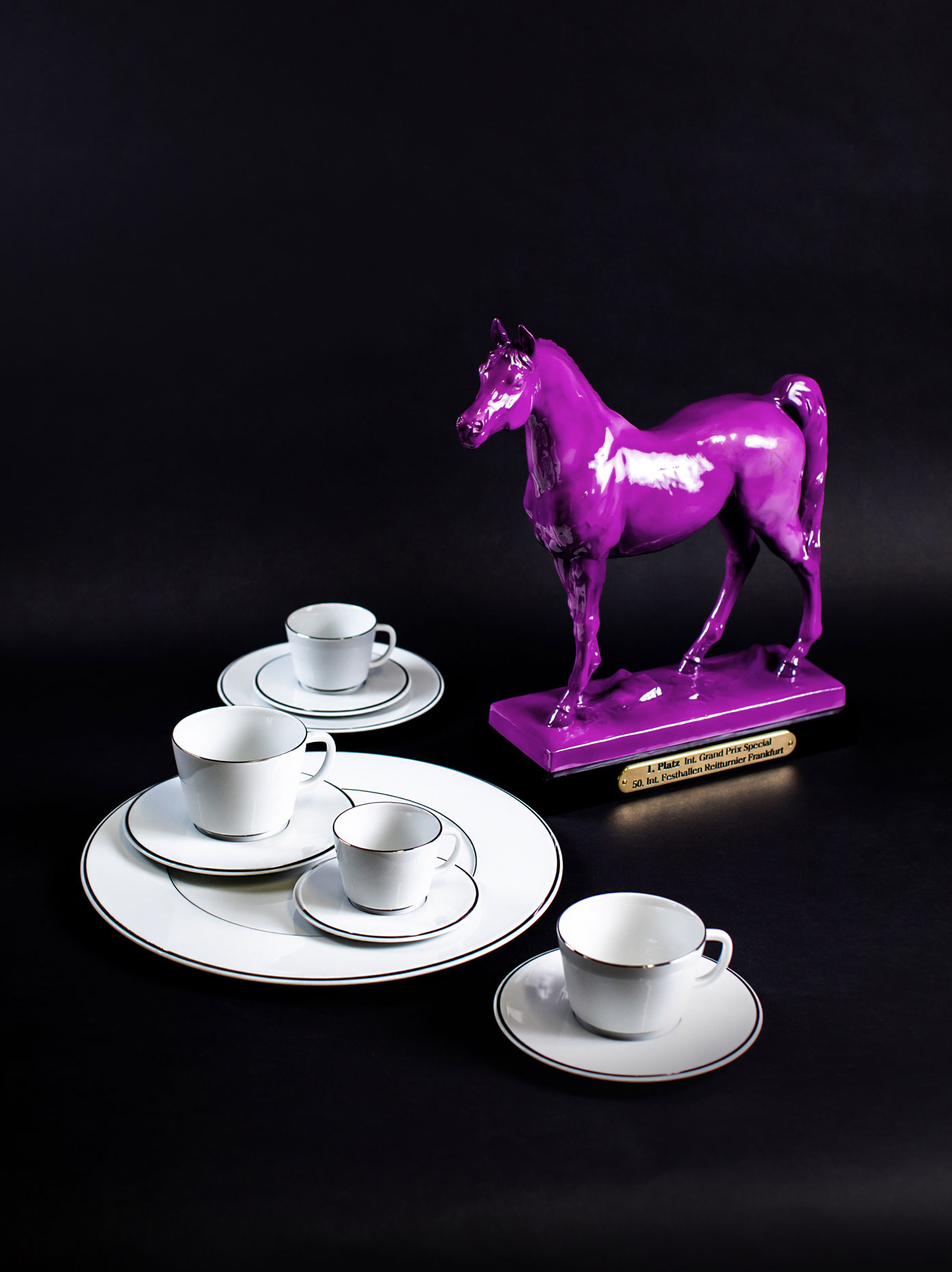 Since 2023, MEISSEN has been providing unique honorary prizes for the winners of the individual disciplines. The champions of the so-called “Youngster Tour”, the “Grand Prix Special” and the “Winning Round” will each receive one of three fine porcelain Arabian stallions by MEISSEN artist Jörg Danielczyk in unmistakable “Frankfurt purple”. In addition, the winner of the “Jump & Drive” special event will be presented with the “Horse Grande” figurine with a very special painting in the style of a finish line flag as a trophy. In this way, the tradition of the renowned tournament, which revolves around the passion of equestrian sport, meets the tradition and passionate craftsmanship of our porcelain manufactory.