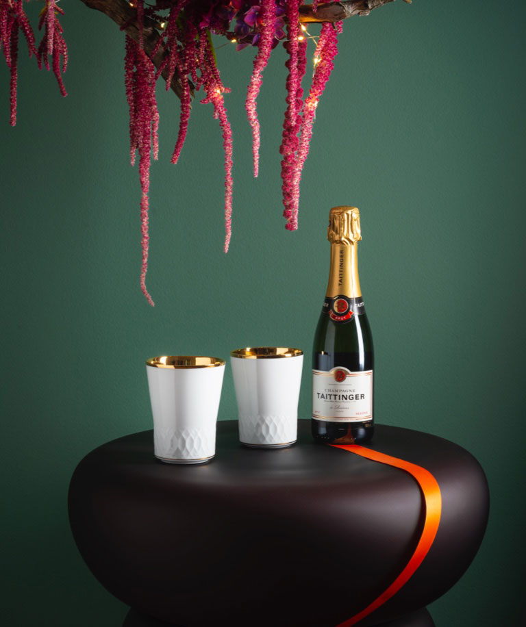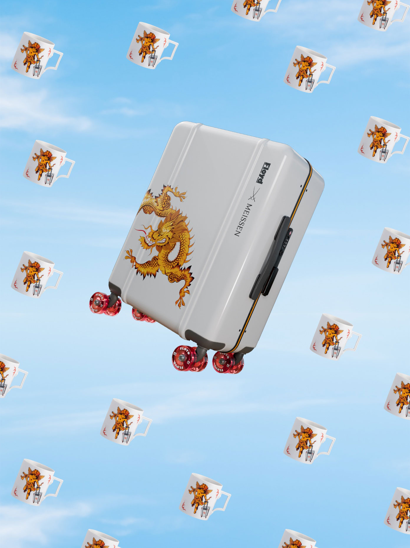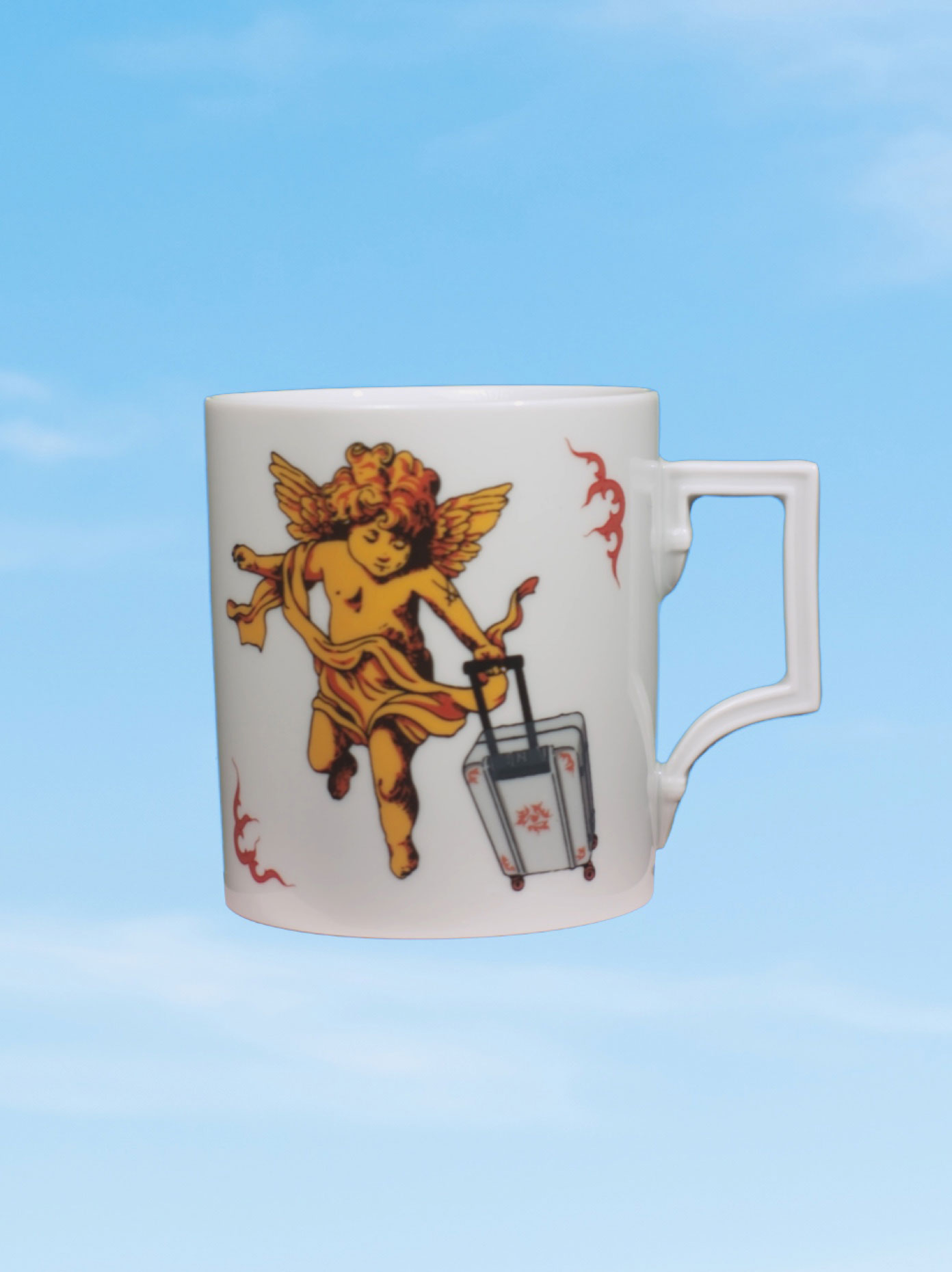 The result is a Floyd x Meissen Travel Case on Wheels, decorated with the world-famous MEISSEN Ming dragon, one of MEISSEN's most famous and oldest designs. In addition, there is a matching porcelain mug with the trademarks of both brands. It is adorned with a chubby-cheeked baroque angel in putto style who travels with a Floyd x MEISSEN case and accompanies you on your trips as your very own personal guardian angel.