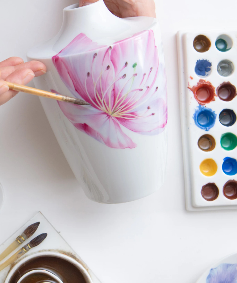 She was particularly shaped by the typical style of flower painting: precise, confidently placed brushstrokes that create light, shadow, and form with a single movement – without endless corrections. This technique not only changed the way she works on porcelain, but also had a lasting influence on her personal painting style.