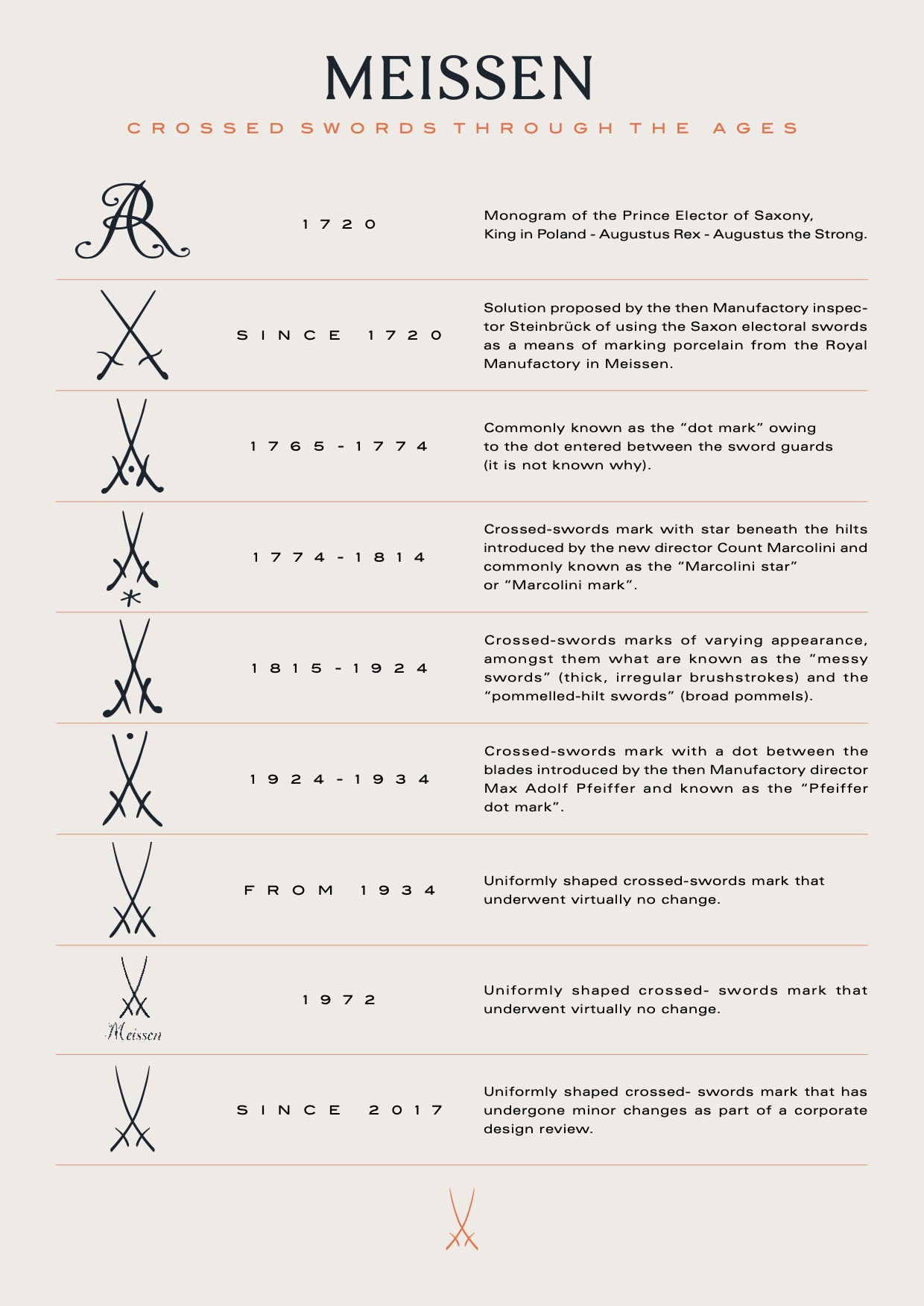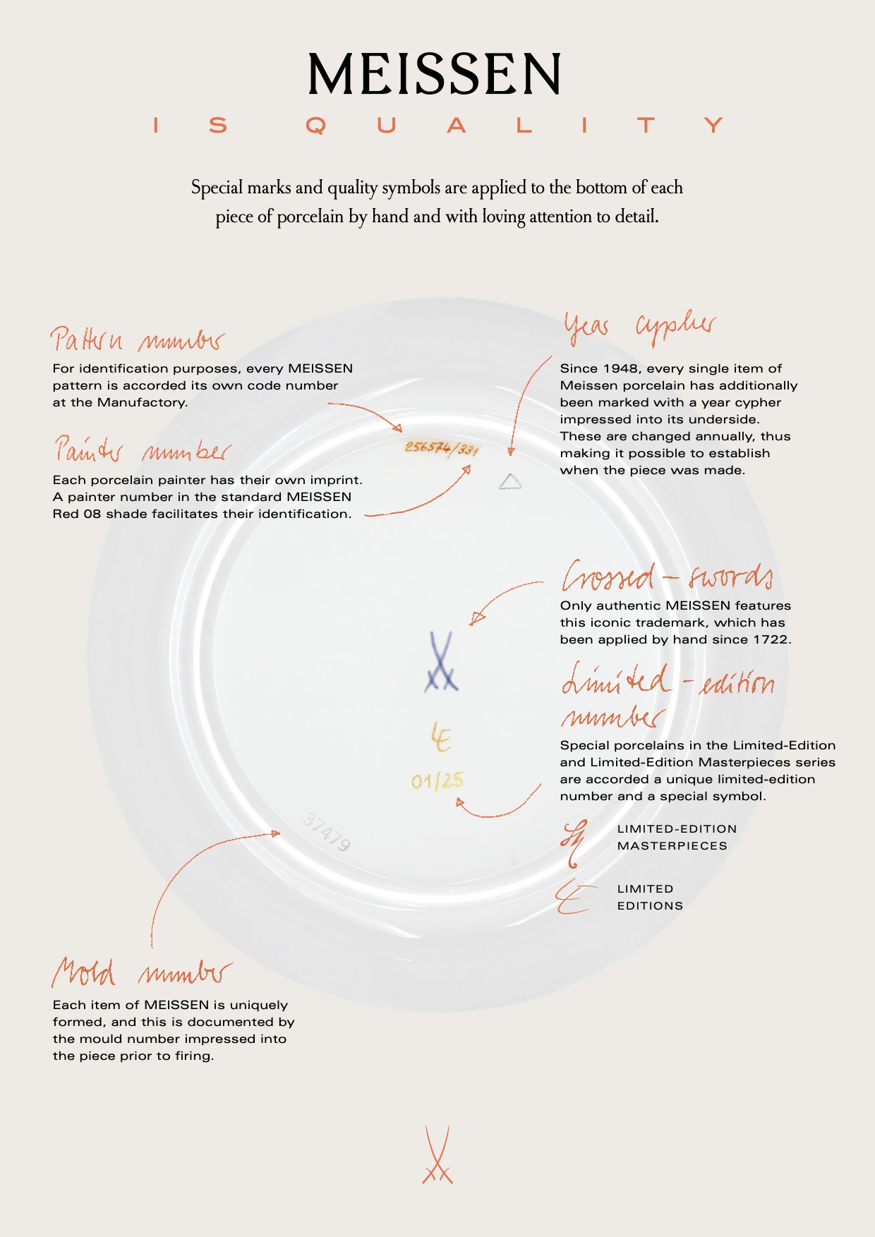 In addition to our trademarked logo, the Crossed Swords, you will find various numbers and signs on the bottom of your porcelain piece. These can be: