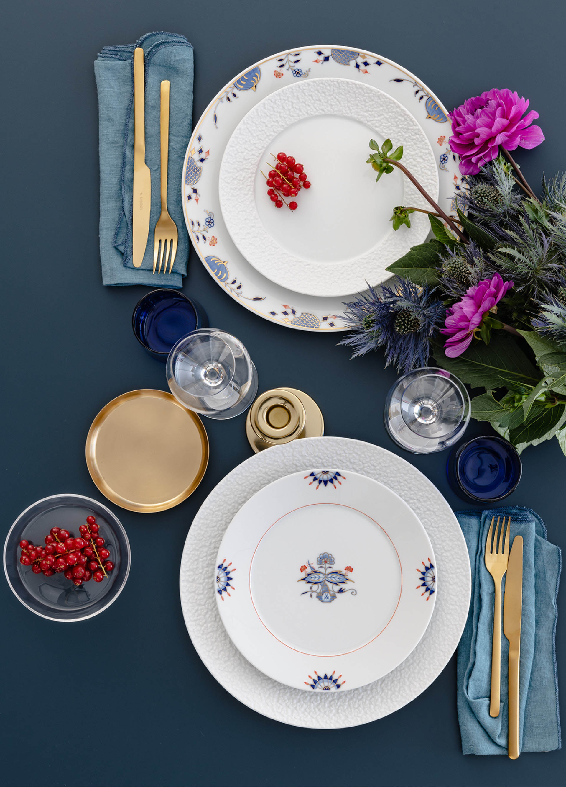 Noble Blue“Noble Blue” revisits one of Meissen’s most famous decorative motifs: the iconic “Onion Patter” from 1731. Inspired by the Eastern Asian porcelains of its time, the “onions” in the pattern are not in fact onions, but rather exotic fruits and blossoms, each with their own assigned placement within the decor. In “Noble Blue” these opulent compositions are pruned and rearranged in a light-hearted, contemporary design, giving the sleek “N°41” tableware series a decorative nod from the past.